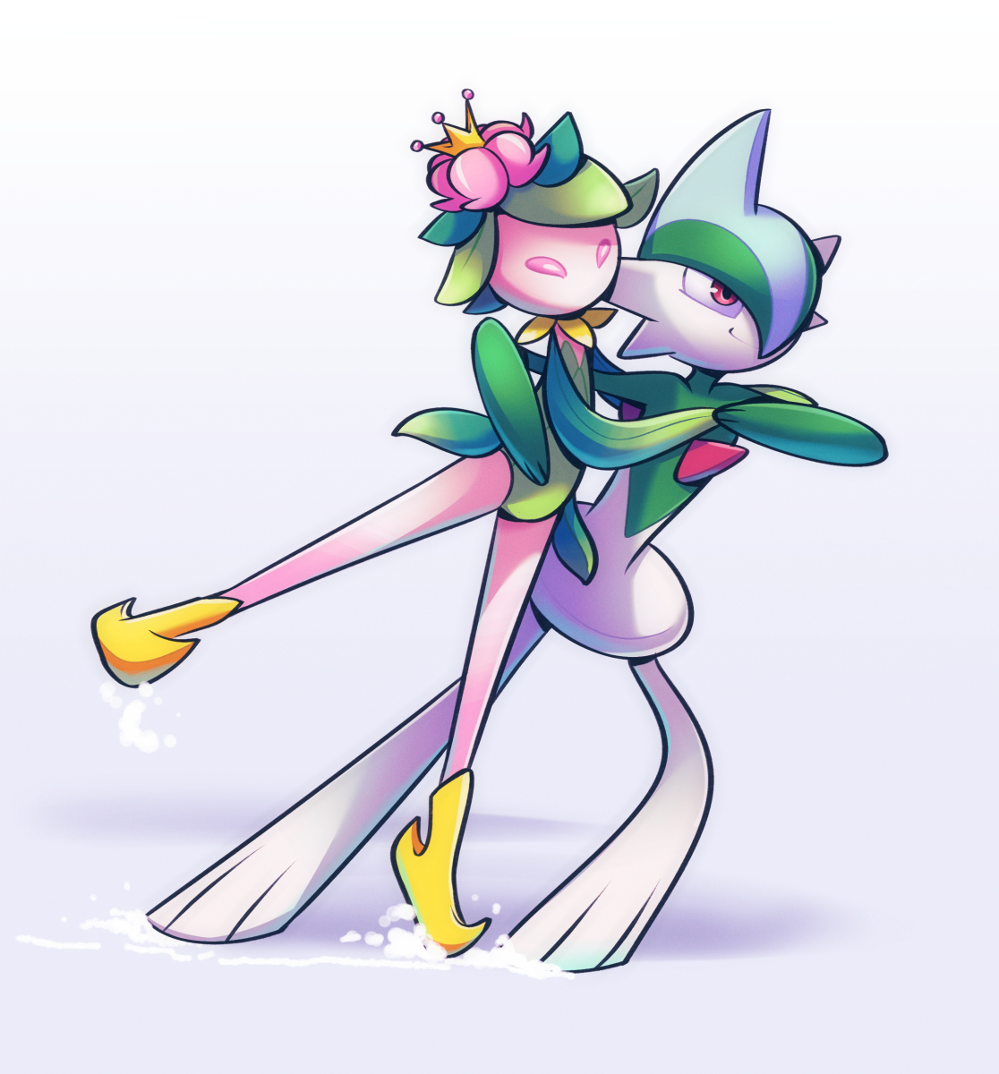 dancing drawfag gallade gen_4_pokemon highres hisuian_lilligant ice_skating nintendo no_humans pink_eyes pokemon pokemon_(creature) red_eyes simple_background skating smile white_background
