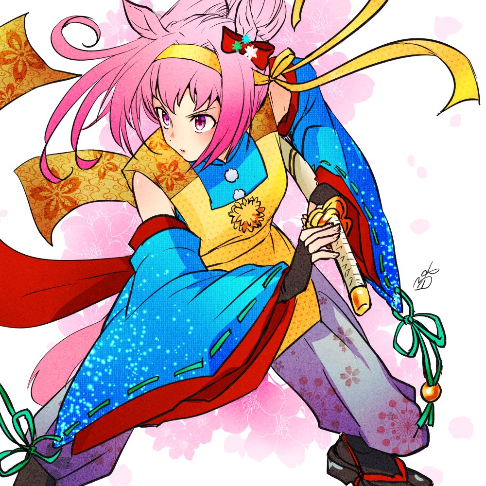 1girl alternate_costume animal_ears apron artist_logo baggy_pants black_gloves black_socks blue_shirt bow closed_mouth detached_sleeves ear_bow fighting_stance fingerless_gloves floral_print gloves hairband haru_urara_(oh_fun_fun!)_(umamusume) haru_urara_(umamusume) holding holding_sheath holding_sword holding_weapon horse_ears horse_girl horse_tail katana logo long_hair nishioki_tama pants pink_eyes pom_pom_(clothes) ready_to_draw sandals sheath shirt sleeveless sleeveless_shirt socks solo standing sword tabi tail umamusume v-shaped_eyebrows weapon