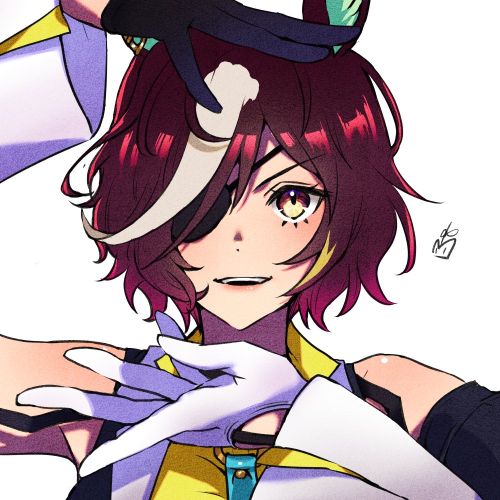 1girl animal_ears arm_up artist_logo black_gloves black_jacket brown_hair detached_sleeves eyepatch gloves hand_up horse_ears jacket logo looking_at_viewer multicolored_hair nishioki_tama open_mouth shirt short_hair sleeveless sleeveless_jacket sleeveless_shirt smile solo straight-on streaked_hair tanino_gimlet_(umamusume) umamusume upper_body white_gloves yellow_eyes yellow_shirt
