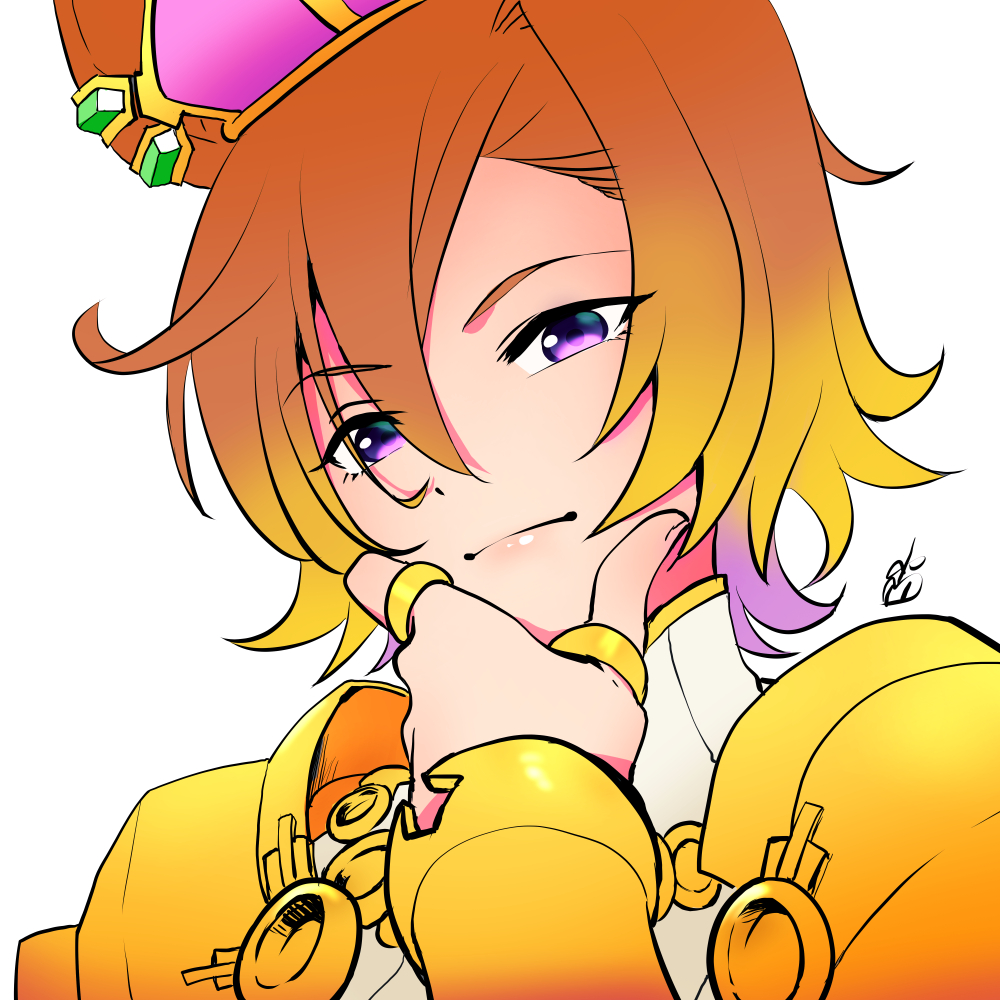 1girl animal_ears armor artist_logo bird closed_mouth crow hair_between_eyes hand_on_own_chin hand_up horse_ears jewelry logo multiple_rings nishioki_tama orange_hair portrait purple_eyes ring shirt short_hair shoulder_armor simple_background smile solo stroking_own_chin t.m._opera_o_(umamusume) umamusume white_background white_shirt
