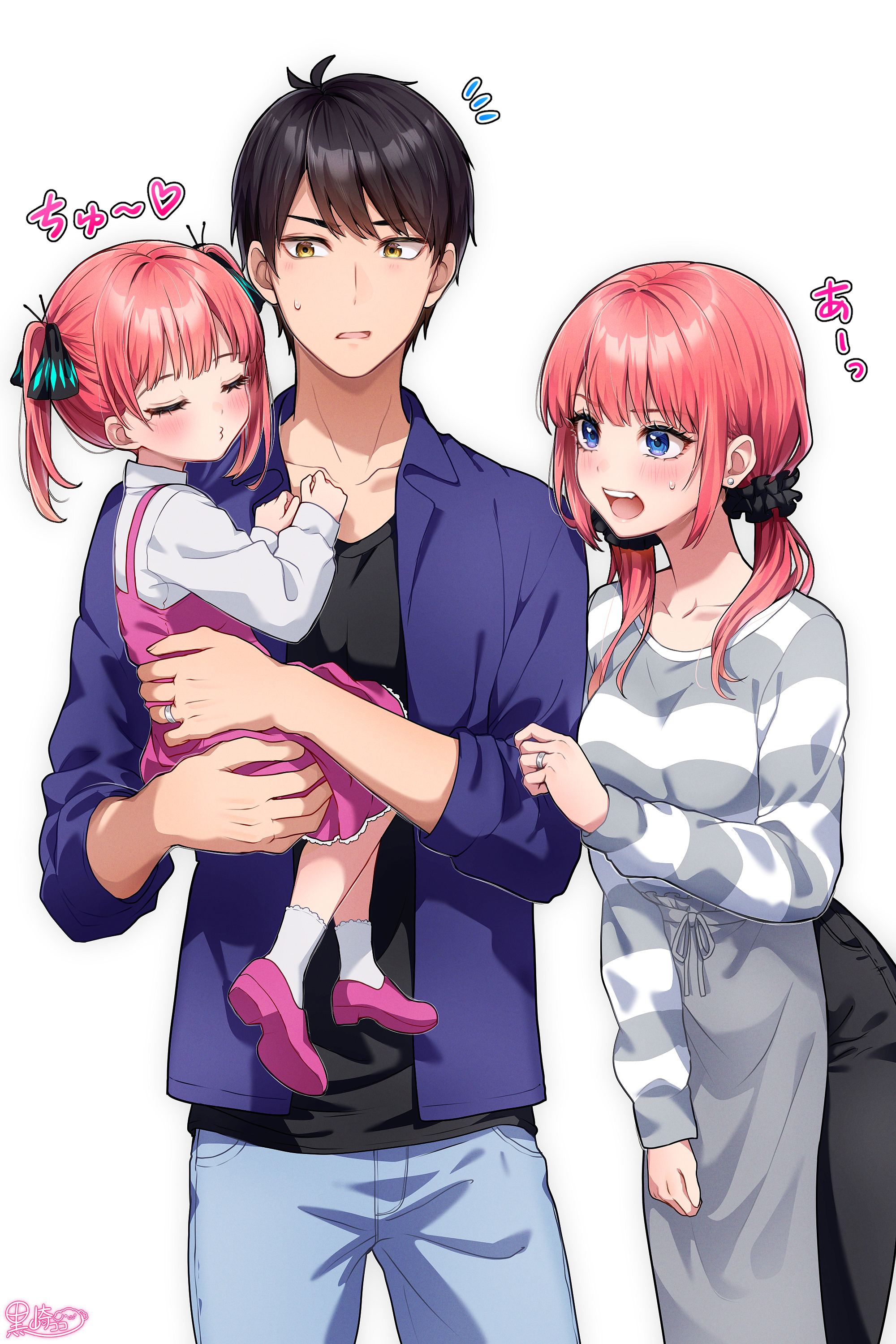 1boy 2girls absurdres apron black_hair black_pants black_ribbon black_scrunchie black_shirt blue_eyes blue_shirt blunt_bangs brown_eyes butterfly_hair_ornament carrying carrying_person child clothes_grab collared_shirt commentary couple denim dress eyelashes family father_and_child father_and_daughter go-toubun_no_hanayome grabbing_another's_sleeve grey_apron hair_ornament hair_ribbon hair_scrunchie hetero highres husband_and_wife if_they_mated incoming_kiss jeans jewelry kurosaki_coco long_hair long_sleeves low_twintails mother_and_child mother_and_daughter multiple_girls nakano_nino o3o pants parent_and_child pinafore_dress pink_dress pink_hair puckered_lips ribbon ring scrunchie shirt short_hair signature sleeveless sleeveless_dress striped_clothes striped_shirt surprised tsurime twintails uesugi_fuutarou waist_apron wedding_ring white_background white_shirt