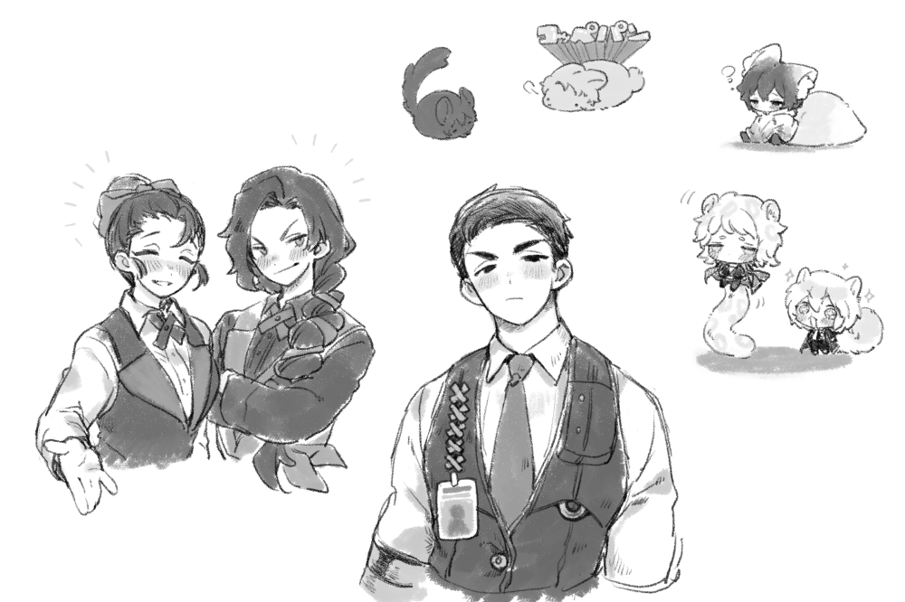 3boys 3girls animal_ears animalization bow braid chibi chinchilla_(animal) collared_shirt cross_tie don_quixote_(project_moon) effie_(project_moon) faust_(project_moon) greyscale hair_bow heathcliff_(project_moon) id_card leopard_ears leopard_tail limbus_company long_hair looking_at_viewer meursault_(project_moon) monochrome multiple_boys multiple_girls necktie project_moon saude_(project_moon) shirt tail uchimura_(rino0525) very_long_hair vest yi_sang_(project_moon)