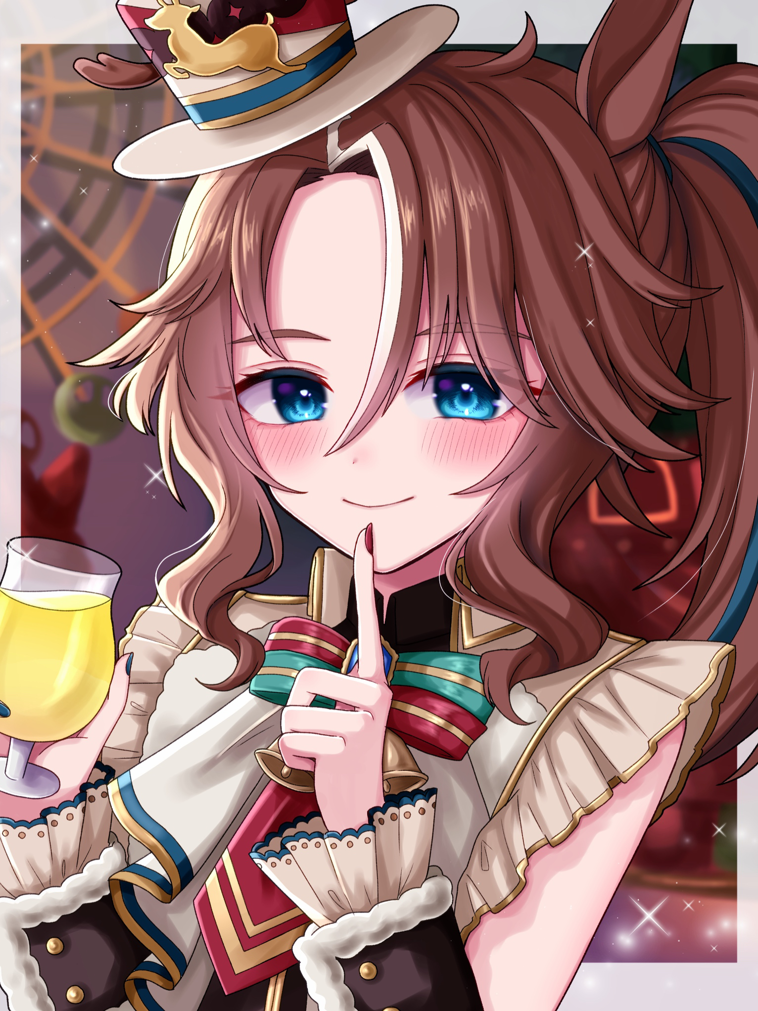 1girl animal_ears bell blue_eyes bow bowtie brown_hair closed_mouth commentary cup detached_sleeves dress frilled_sleeves frills hat highres holding holding_cup horse_ears horse_girl index_finger_raised looking_at_viewer medium_hair mejiro_palmer_(umamusume) mejiro_palmer_(warm-hearted_reindeer)_(umamusume) mini_hat mini_top_hat multicolored_hair neck_bell official_alternate_costume ponytail sleeveless sleeveless_dress smile solo sparkle streaked_hair tilted_headwear top_hat tyamu_mu umamusume upper_body white_dress white_hat