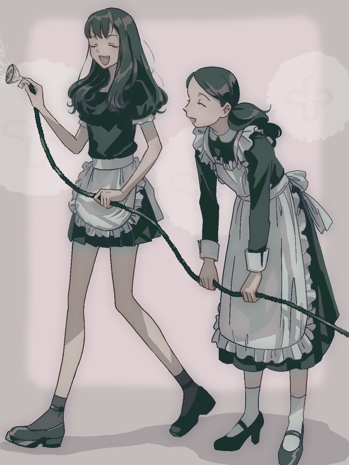 2girls ^_^ abstract_background apron bent_over black_dress black_footwear black_hair black_shirt black_skirt black_socks closed_eyes commentary_request dress fang frilled_apron frills full_body hide_tani high_heels highres holding holding_hose hose light_blush long_dress long_hair long_sleeves low_ponytail maid maid_apron mashiro_satonaka minagawa_nanami multiple_girls open_mouth pleated_skirt ponytail puffy_short_sleeves puffy_sleeves rip_van_winkle_no_hanayome shirt shoes short_sleeves skirt smile socks spraying standing waist_apron wavy_hair white_apron white_socks