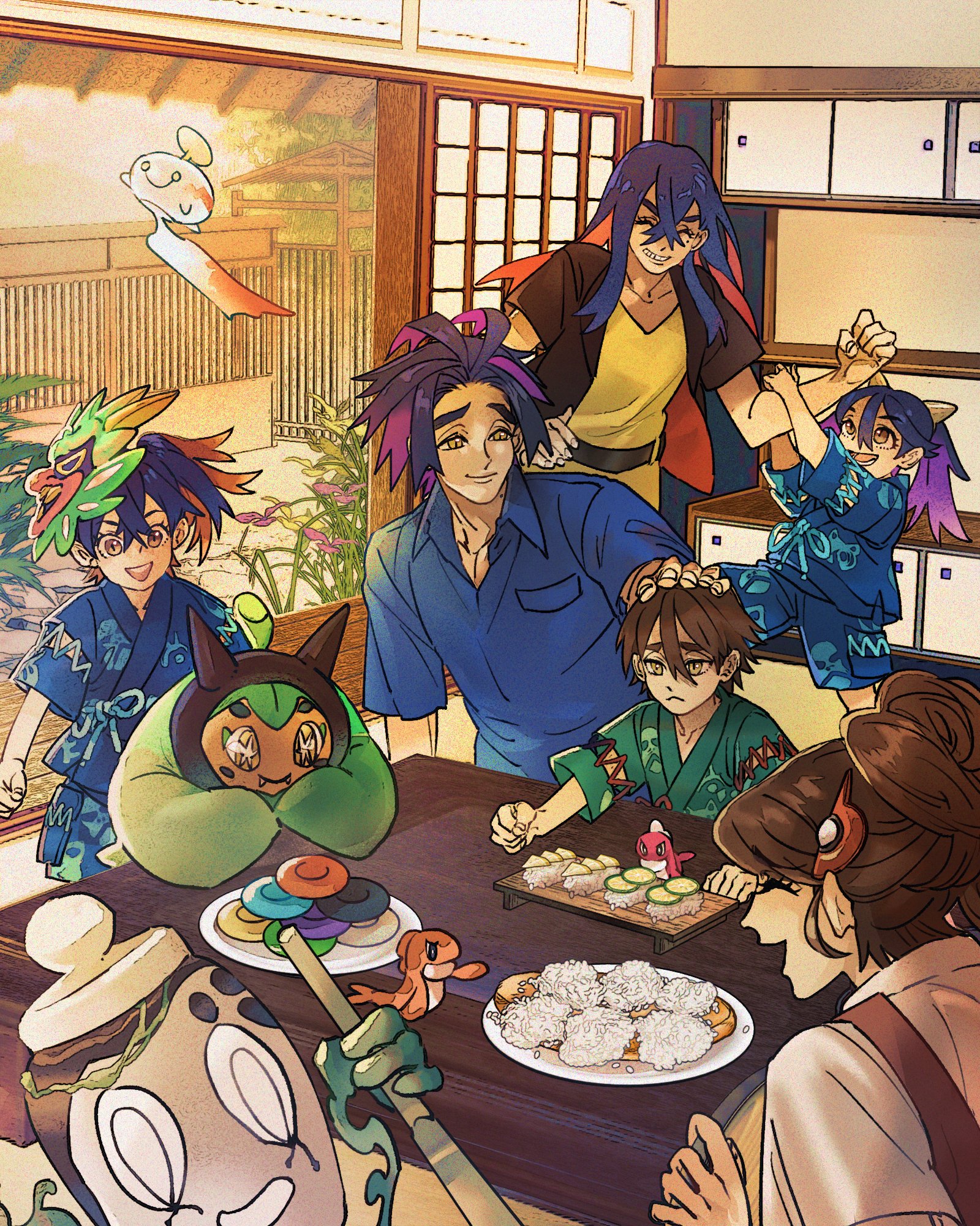 3boys 3girls alternate_universe blue_hair blue_kimono blue_shirt brown_eyes carmine_(pokemon) chimecho clenched_hand closed_eyes collarbone colored_inner_hair commentary_request crossed_bangs cucumber cupboard eyelashes floating florian_(pokemon) frown gen_3_pokemon hand_on_another's_head highres if_they_mated indoors japanese_clothes kieran_(pokemon) kimono long_hair mask multicolored_hair multiple_boys multiple_girls nintendo ogerpon open_mouth original plant plate pokemon pokemon_(creature) pokemon_scarlet_and_violet purple_hair red_hair rice sad shirt short_hair sinistcha slice_of_life smile star-shaped_pupils star_(symbol) stb81370884 symbol-shaped_pupils table tatsugiri tatsugiri_(curly) tatsugiri_(droopy) teeth two-tone_hair unworn_mask wooden_table yellow_eyes