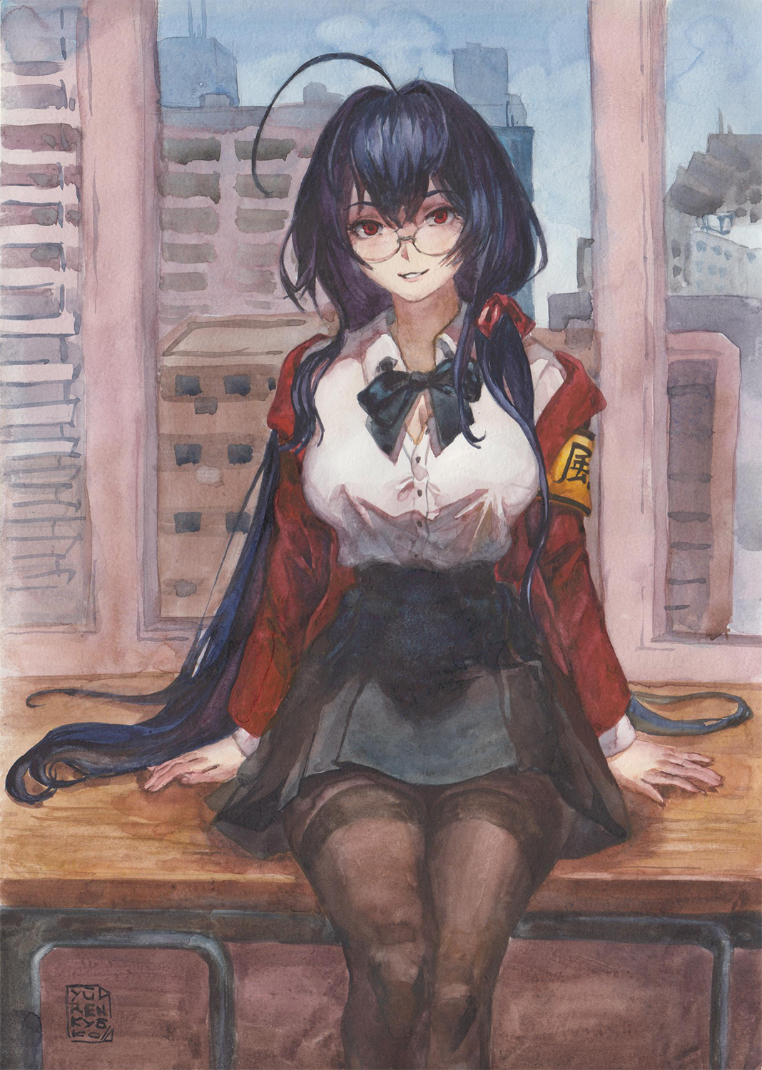 1girl ahoge armband azur_lane black_bow black_hair black_skirt bow bowtie breasts brown_pantyhose cityscape desk glasses hair_between_eyes hair_ribbon hair_spread_out highres jacket large_breasts long_hair looking_at_viewer off_shoulder official_alternate_costume on_table painting_(medium) pantyhose partially_unbuttoned pleated_skirt red_eyes red_jacket ribbon rimless_eyewear school_desk school_uniform shirt signature sitting skirt smile solo table taihou_(azur_lane) taihou_(sweet_time_after_school)_(azur_lane) thighband_pantyhose traditional_media tress_ribbon very_long_hair watercolor_(medium) white_shirt window yellow_armband yuuren_kyouko