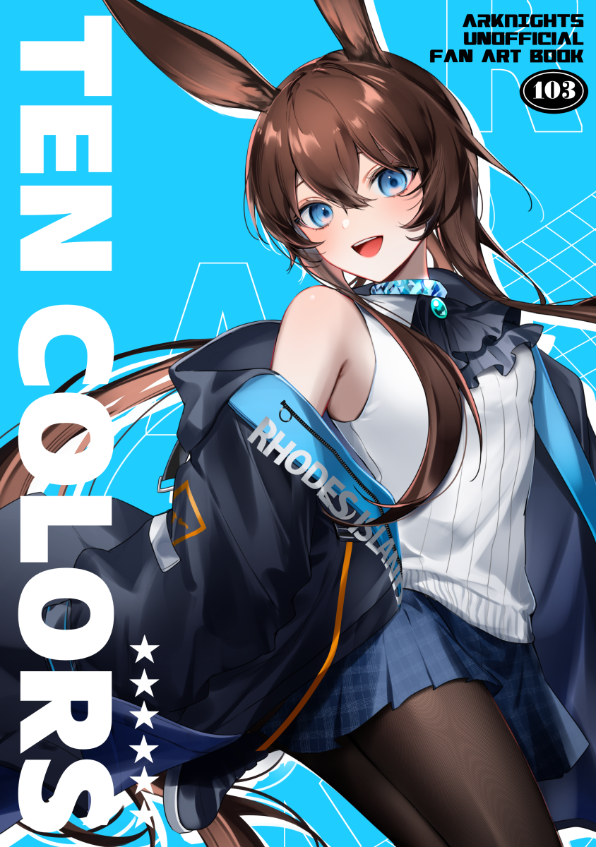 1girl amiya_(arknights) animal_ear_fluff animal_ears arknights black_jacket black_shoes blue_background blue_eyes blue_skirt breasts brown_hair brown_pantyhose comiket_103 commentary_request drop_shadow hair_between_eyes highres jacket long_hair long_sleeves looking_at_viewer off_shoulder open_clothes open_jacket pantyhose plaid_clothes plaid_skirt pleated_skirt ponytail puffy_long_sleeves puffy_sleeves rabbit_ears shirt shoes sidelocks skirt sleeveless sleeveless_shirt sleeves_past_fingers sleeves_past_wrists small_breasts solo umeno_shii very_long_hair white_shirt