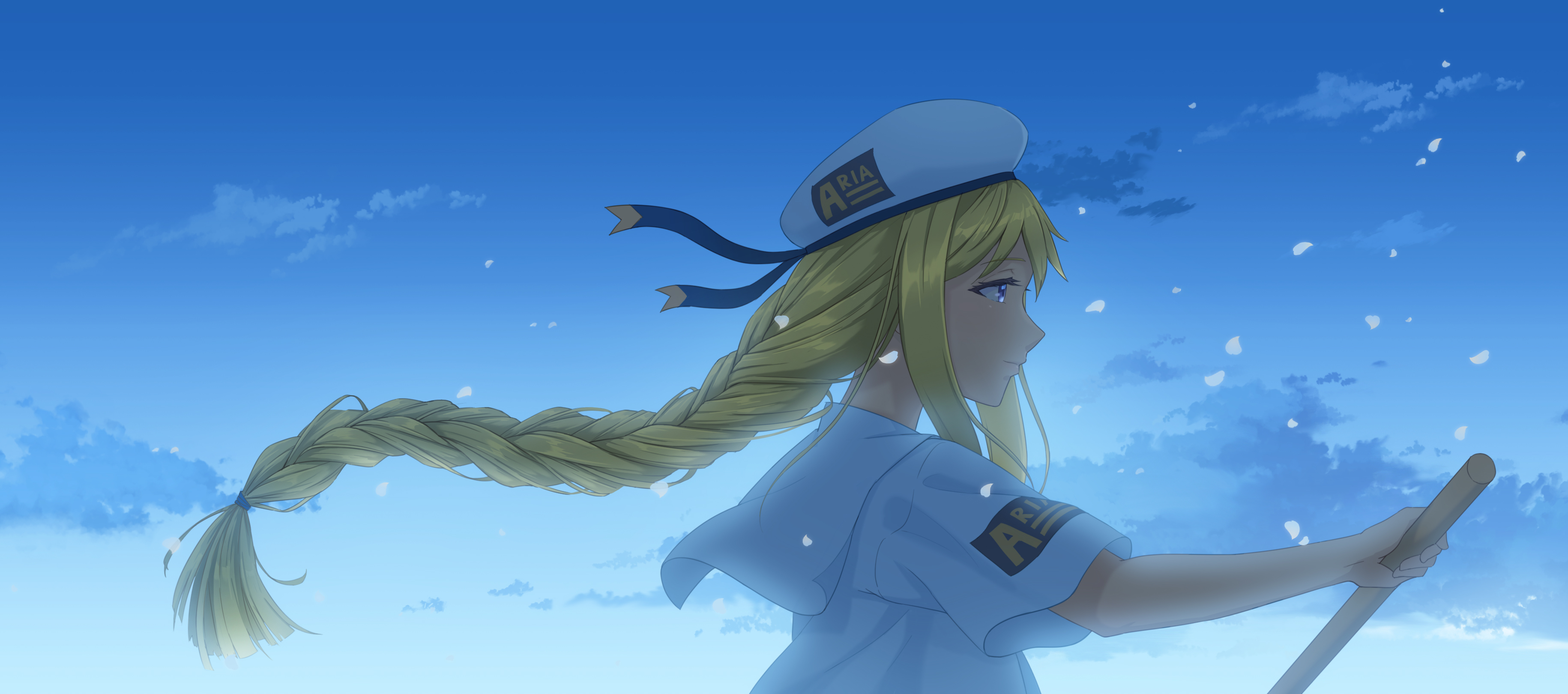 1girl absurdres alicia_florence aria_(manga) aria_company_uniform beret blue_background blue_eyes blue_ribbon blue_sky braid braided_ponytail bread_fqy closed_mouth cloud cloudy_sky eyelashes falling_petals from_side gradient_sky hat hat_ribbon highres holding holding_oar long_hair looking_to_the_side oar outdoors parted_bangs petals ribbon sailor_collar short_sleeves sidelocks sky solo upper_body white_hat