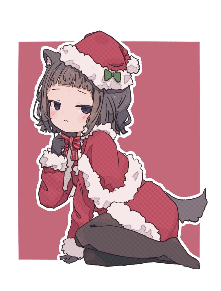 1girl animal_ear_fluff animal_ears black_gloves black_hair black_pantyhose blush bow brown_eyes capelet closed_mouth dress forehead full_body fur-trimmed_capelet fur-trimmed_dress fur-trimmed_headwear fur-trimmed_sleeves fur_trim gloves hand_up hat long_sleeves looking_at_viewer no_shoes original outline pantyhose red_background red_bow red_capelet red_dress red_hat santa_costume santa_hat sleeves_past_wrists solo striped_bow tail tilted_headwear two-tone_background uzoumuzo wavy_mouth white_background white_outline