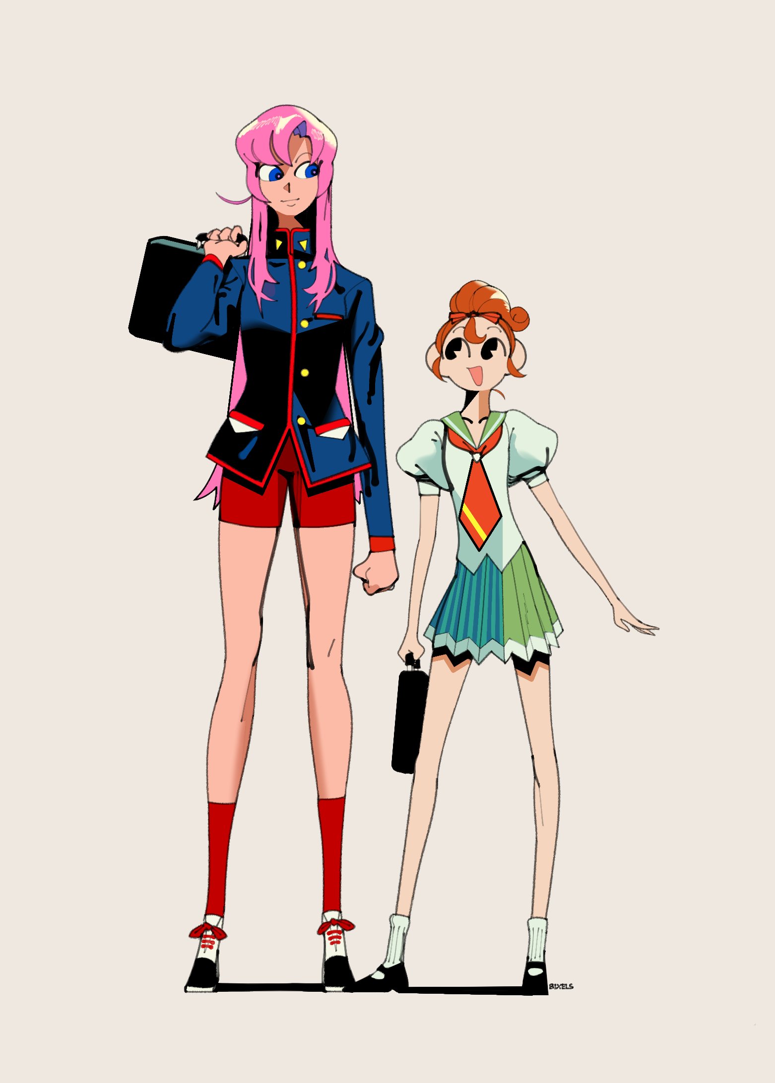 2girls artist_name bag bike_shorts bixelswixels black_jacket blue_eyes brown_hair commentary english_commentary green_sailor_collar green_skirt height_difference highres holding holding_bag jacket long_hair looking_at_another medium_hair military_uniform multiple_girls necktie open_mouth pink_hair pleated_skirt puffy_short_sleeves puffy_sleeves red_necktie red_shorts red_socks sailor_collar school_uniform shadow shinohara_wakaba shirt short_sleeves shorts shoujo_kakumei_utena shoulder_bag signature simple_background skirt socks standing tenjou_utena white_background white_shirt white_socks