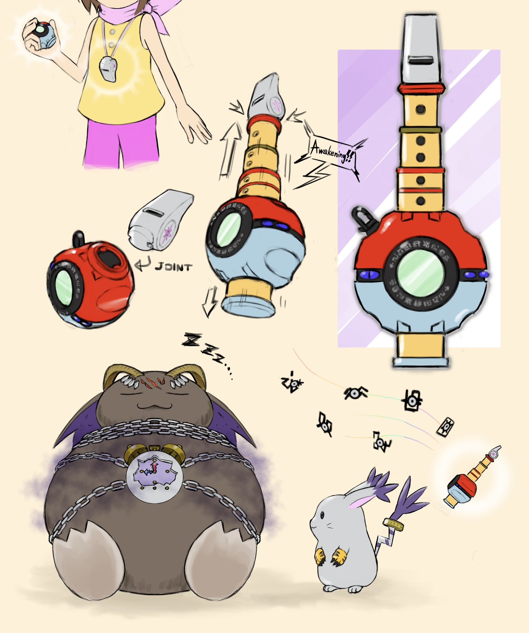 belphemon belphemon_sleep_mode chain digimoji digimon digivice fusion gen_1_pokemon gen_2_pokemon gloves highres holy_ring horns looking_at_another mas_square nintendo pikachu poke_ball poke_flute pokemon tailmon unown whistle whistle_around_neck wings yagami_hikari