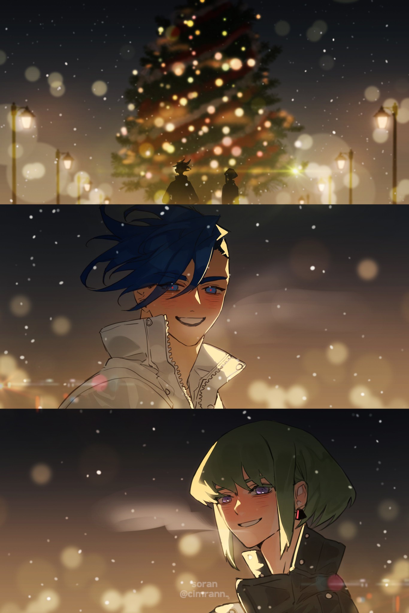 2boys blue_eyes blue_hair blush breath christmas christmas_tree couple earrings galo_thymos green_hair highres jewelry lamppost lio_fotia looking_at_another male_focus merry_christmas mohawk multiple_boys night outdoors promare purple_eyes short_hair short_hair_with_long_locks sidelocks single_earring smile snow snowing so-rann spiked_hair triangle_earrings upper_body winter yaoi