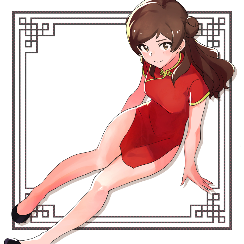 1girl alternate_hairstyle arm_support black_footwear blush breasts brown_eyes brown_hair china_dress chinese_clothes closed_mouth dot_nose dress flats from_above hair_bun idolmaster idolmaster_million_live! idolmaster_million_live!_theater_days kitazawa_shiho long_hair looking_at_viewer looking_up medium_breasts pelvic_curtain red_dress shirop_imas short_sleeves side_slit single_hair_bun sitting smile solo white_background