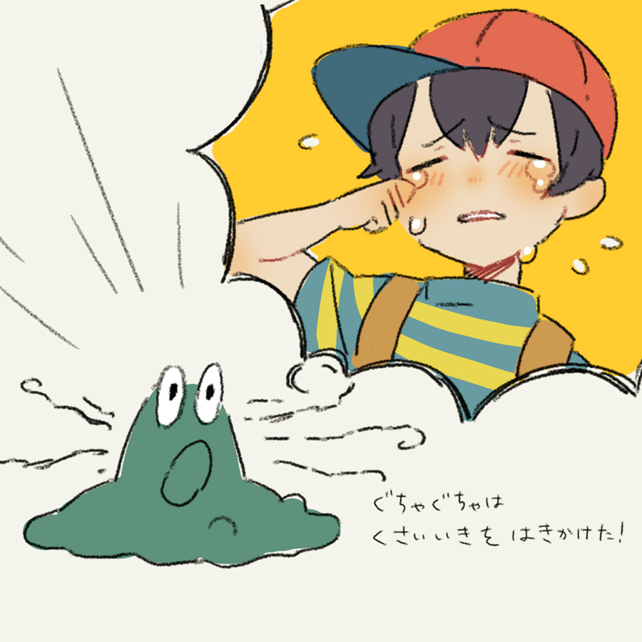 1boy backpack bag black_hair crying male_focus mother_(series) mother_2 ness_(mother_2) nintendo no_nose open_mouth orange_background red_headwear shifumame shirt short_hair slimy_little_pile striped_clothes striped_shirt tears translation_request wiping_tears