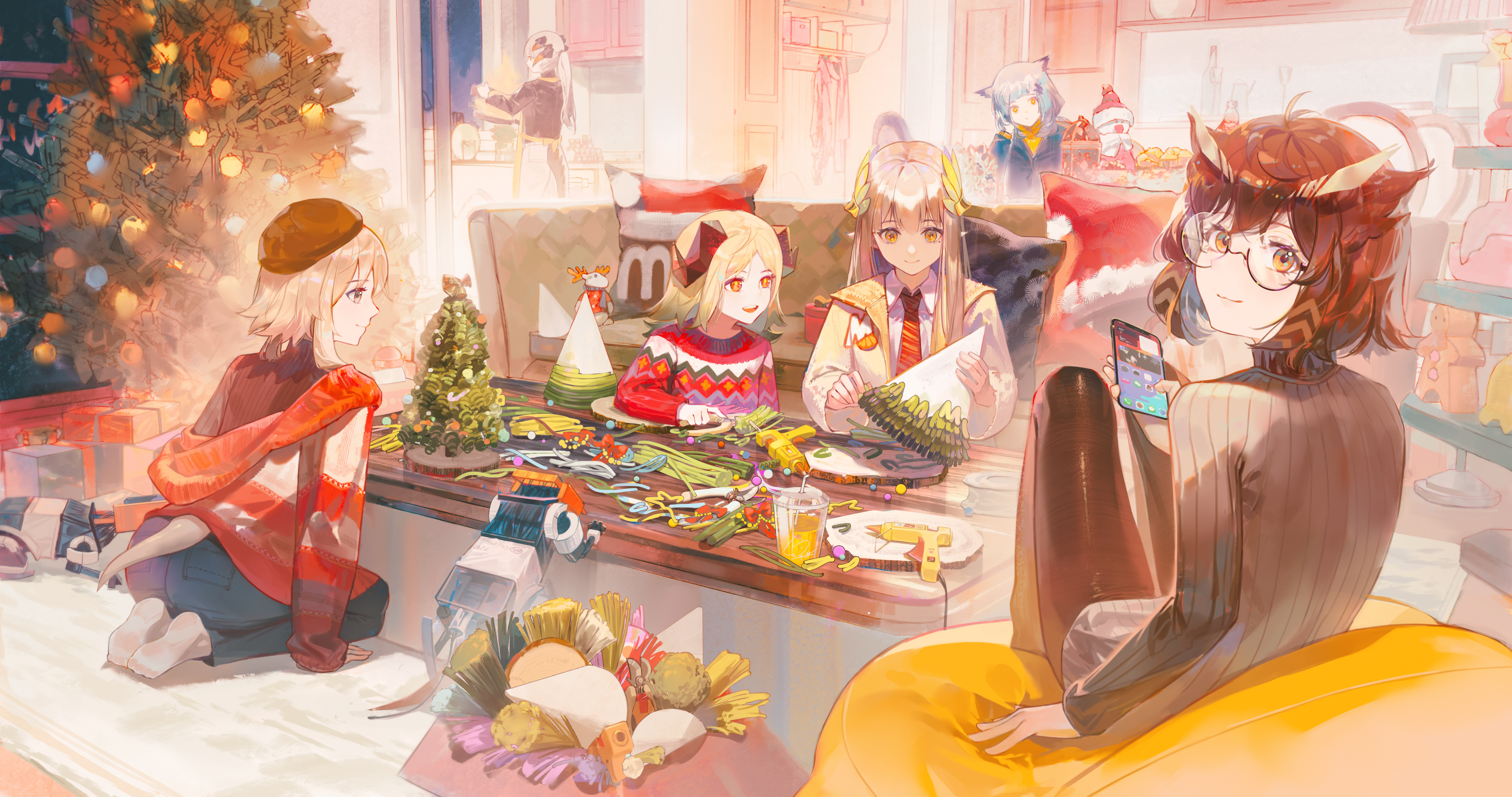 6+girls absurdly_detailed_composition absurdres antenna_hair arknights arts_and_crafts beret black_headwear black_jacket black_pants black_pantyhose black_sweater blonde_hair bottle brown_hair brown_jacket brown_sweater cellphone christmas christmas_sweater christmas_tree collared_shirt couch cup cupboard cushion demon_horns dragon_girl dragon_horns dragon_tail glue_gun grey_hair hair_ornament hand_in_own_hair hat highres holding holding_phone horns ifrit_(arknights) indoors jacket laurels loaded_interior long_hair long_sleeves looking_at_viewer looking_back lyuqiu mayer_(arknights) medium_hair muelsyse_(arknights) multiple_girls necktie night open_mouth orange_eyes otter_girl otter_tail owl_ears pants pantyhose party_hat phone pointy_ears ponytail ptilopsis_(arknights) red_necktie red_sweater rhine_lab_(arknights) ribbed_sweater robot saria_(arknights) seiza semi-rimless_eyewear shelf shirt short_hair silence_(arknights) sitting smartphone smile snowman socks sweater table tail teeth under-rim_eyewear upper_teeth_only white_pants white_shirt white_socks yellow_eyes yellow_sweater