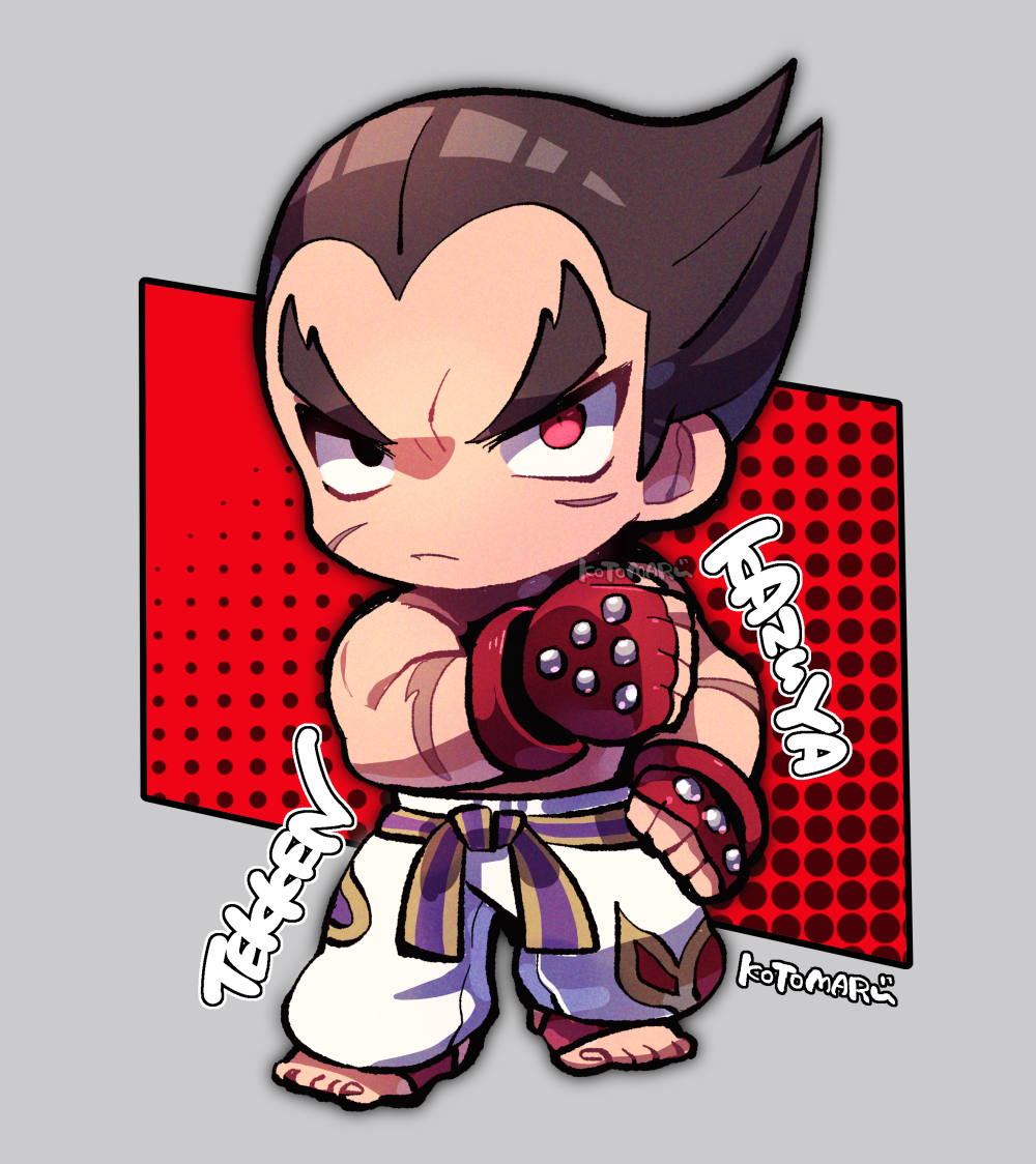 1boy belt black_eyes character_name clenched_hand closed_mouth copyright_name fingernails frown full_body gloves hand_on_own_hip kotomaru_(kotokoto_kottan) looking_at_viewer male_focus mishima_kazuya no_nose pants purple_belt red_eyes red_gloves scar scar_on_arm signature standing studded_gloves tekken thick_eyebrows topless_male v-shaped_eyebrows white_pants