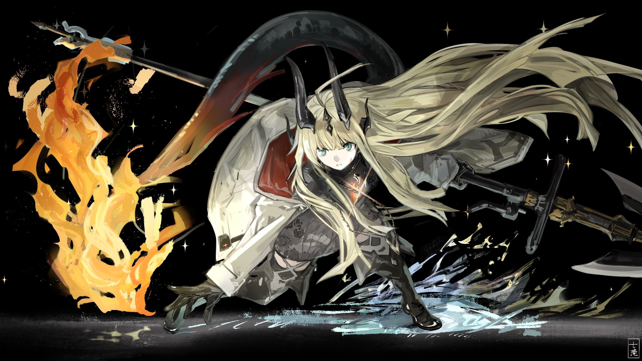 1girl arknights black_background black_boots black_gloves black_horns black_sweater blonde_hair boots dragon_girl dragon_horns dragon_tail fire flame-tipped_tail full_body gloves green_eyes highres holding holding_staff horns jacket light_in_heart looking_at_viewer nanataru10 open_clothes open_jacket parted_lips reed_(arknights) simple_background sketch solo staff sweater tail white_jacket wind