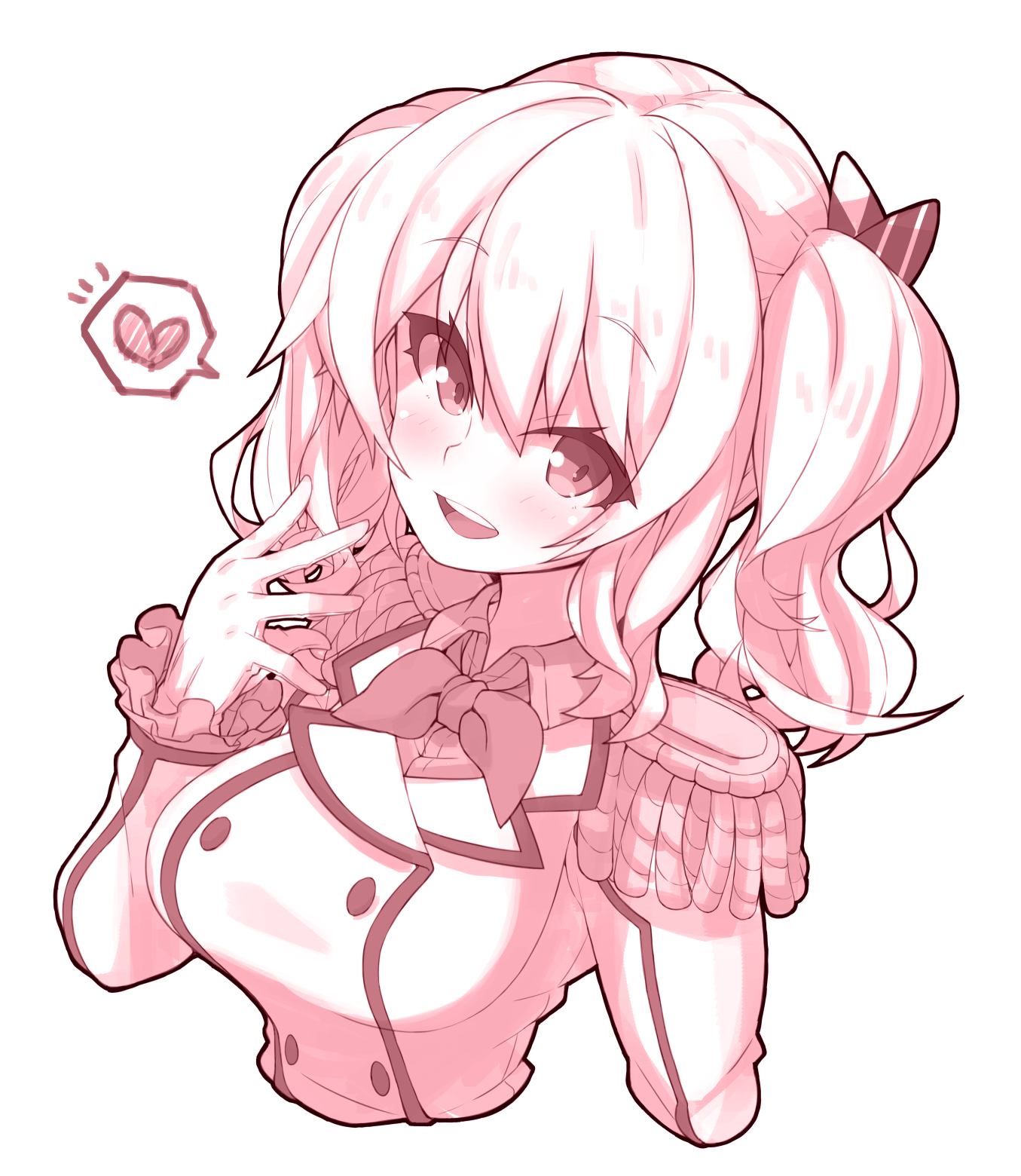 1girl :d bow breasts cropped_torso epaulettes hair_bow head_tilt heart highres kantai_collection kashima_(kancolle) looking_at_viewer medium_breasts medium_hair monochrome open_mouth pink_theme rikumaru shirt simple_background smile solo spoken_heart twintails upper_body white_background