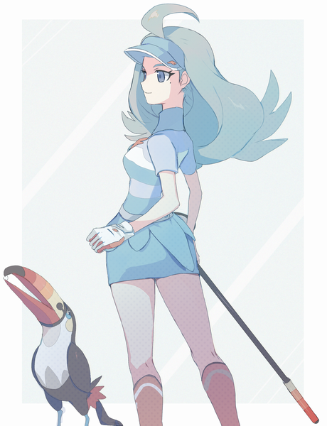 1girl bird blue_eyes blue_hair blue_headwear blue_shirt blue_skirt buttons collared_shirt flipped_hair gen_7_pokemon golf_club holding holding_golf_club kahili_(pokemon) kneehighs light_blue_hair long_hair mole mole_under_eye mxkjxm_(nhss2337) nintendo orange_socks pokemon pokemon_(creature) pokemon_sun_and_moon shirt short_sleeves skirt socks striped_clothes striped_shirt toucan toucannon visor_cap white_shirt z-ring