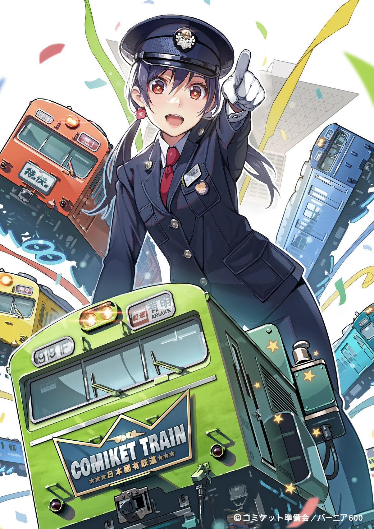 1girl black_hair brown_eyes comiket_103 commentary_request gloves hair_ornament hat highres jr_103_series long_sleeves looking_at_viewer low_twintails multiple_unit_train necktie open_mouth peaked_cap pointing ribbon solo star-shaped_pupils star_(symbol) symbol-shaped_pupils tokyo_big_sight train twintails uniform vania600