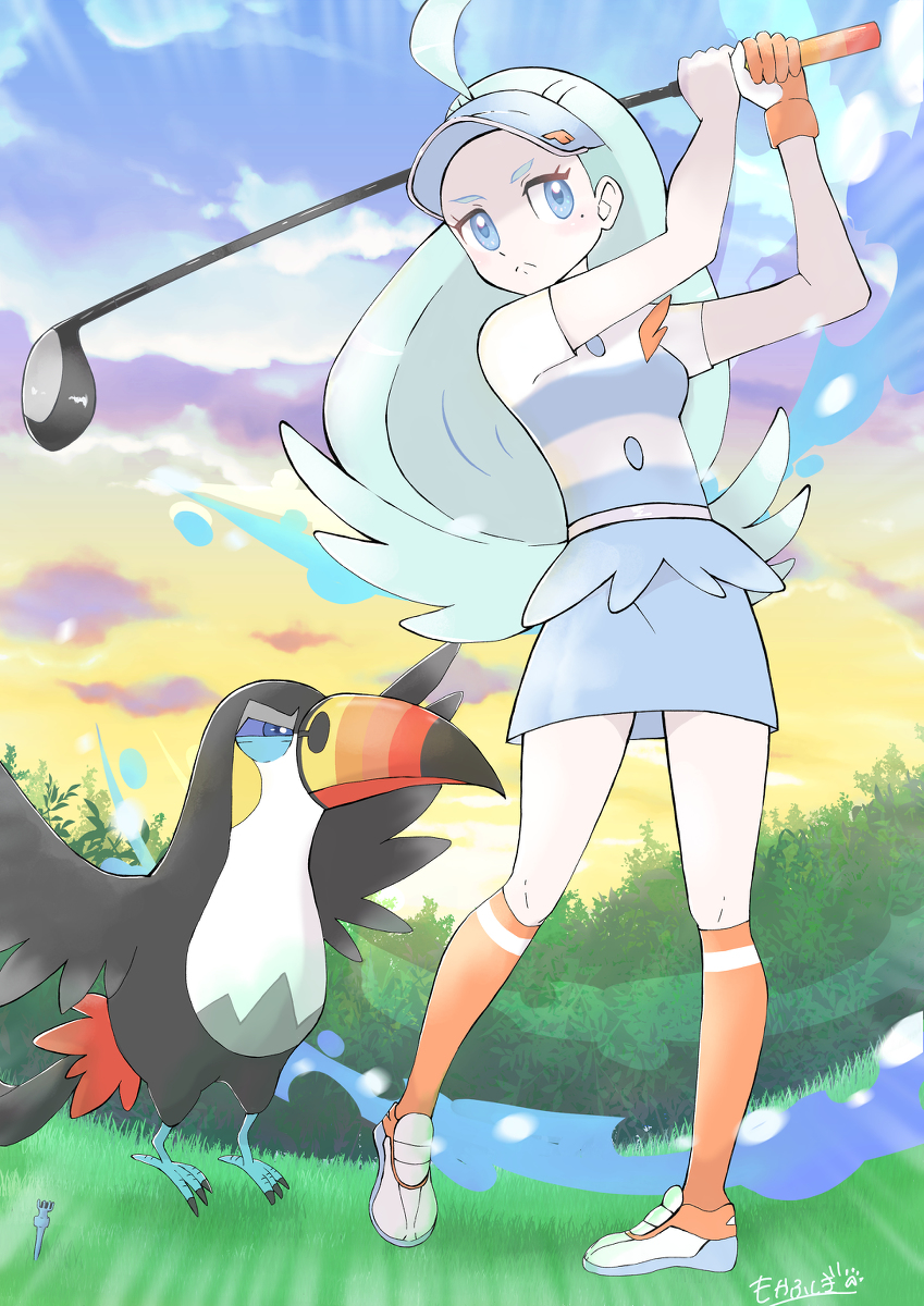1girl ahoge bird blue_eyes blue_hair blue_headwear blue_shirt blue_skirt breasts buttons collared_shirt flipped_hair gen_7_pokemon gloves golf_club highres holding holding_golf_club kahili_(pokemon) kneehighs light_blue_hair long_hair medium_breasts mocha_fushigi mole mole_under_eye nintendo orange_socks pokemon pokemon_(creature) pokemon_sun_and_moon shirt single_glove skirt socks striped_clothes striped_shirt toucan toucannon visor_cap white_gloves white_shirt