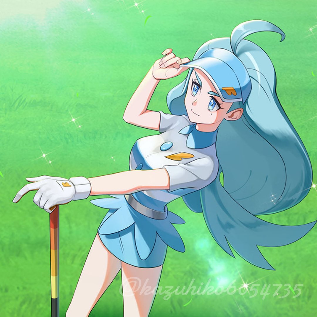 1girl ahoge blue_eyes blue_hair blue_hat blue_shirt blue_skirt breasts buttons collared_shirt flipped_hair gloves golf_club hat holding holding_golf_club kahili_(pokemon) kazuhiko_(feihukazuhiko) light_blue_hair long_hair medium_breasts mole mole_under_eye nintendo pokemon pokemon_sun_and_moon shirt short_sleeves single_glove skirt solo striped_clothes striped_shirt visor_cap white_gloves white_shirt