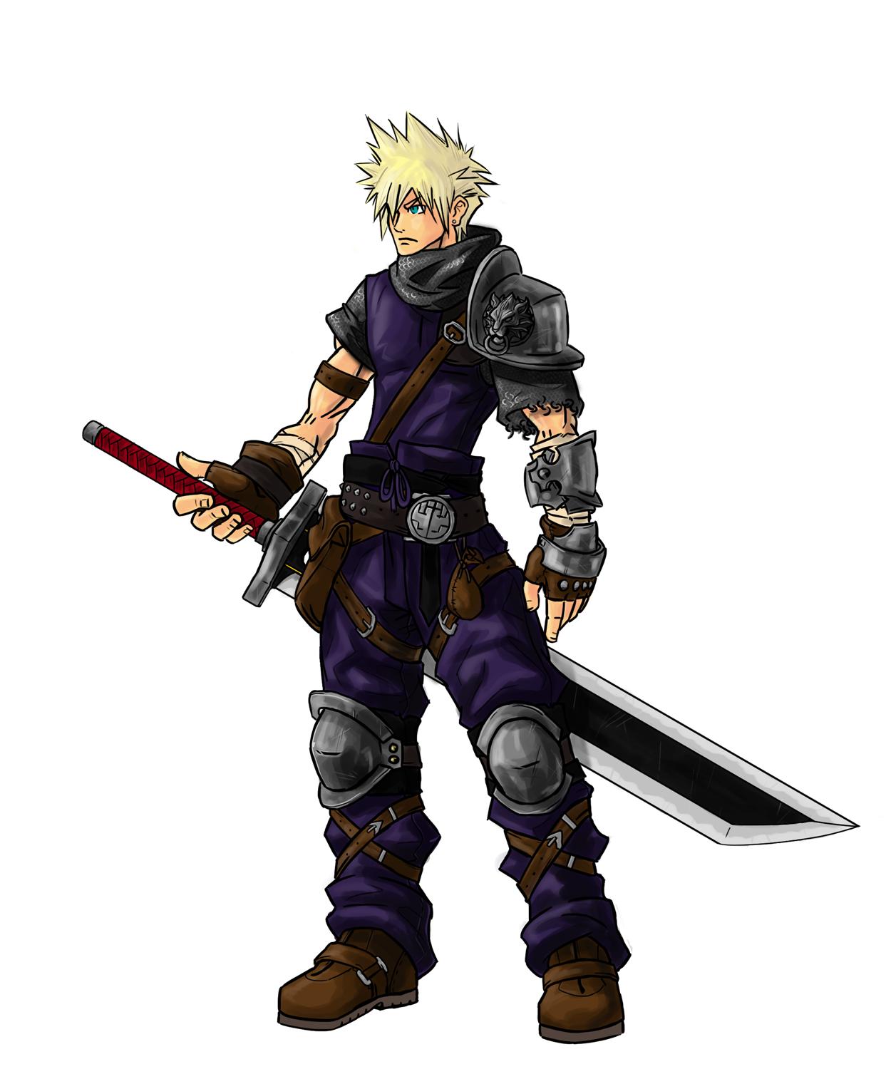 1boy alternate_costume arm_armor armor baggy_pants bandaged_arm bandages belt belt_pouch blonde_hair blue_eyes boots brown_footwear buster_sword chainmail closed_mouth cloud_strife earrings final_fantasy final_fantasy_vii fingerless_gloves full_body gloves hair_over_one_eye highres holding holding_sword holding_weapon jewelry kenji893 knee_pads leg_belt male_focus medieval pants pauldrons pouch purple_pants purple_shirt shirt short_sleeves shoulder_armor single_pauldron spiked_hair studded_gloves sword weapon white_background