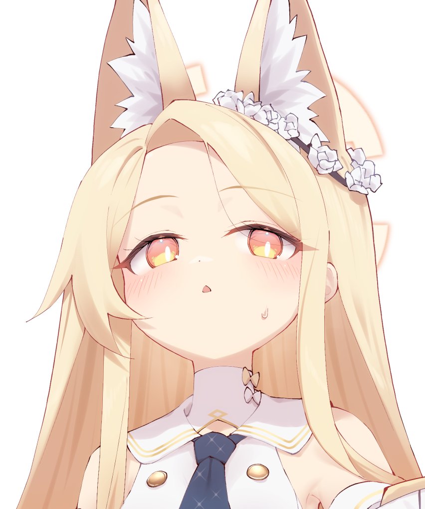 1girl animal_ear_fluff animal_ears bare_shoulders blonde_hair blue_archive commentary_request dress fox_ears halo long_hair n4gare_b0shi parted_lips portrait seia_(blue_archive) simple_background solo triangle_mouth white_background white_dress yellow_eyes yellow_halo