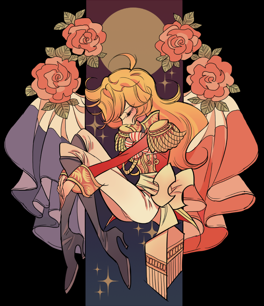 1girl aiguillette black_boots blonde_hair boots closed_eyes epaulettes facing_to_the_side flower french_flag from_side full_body high_heel_boots high_heels hugging_own_legs jacket knees_up long_hair long_sleeves meremero oscar_francois_de_jarjayes pants pink_flower pink_rose profile red_jacket rose sitting solo sparkle versailles_no_bara white_pants