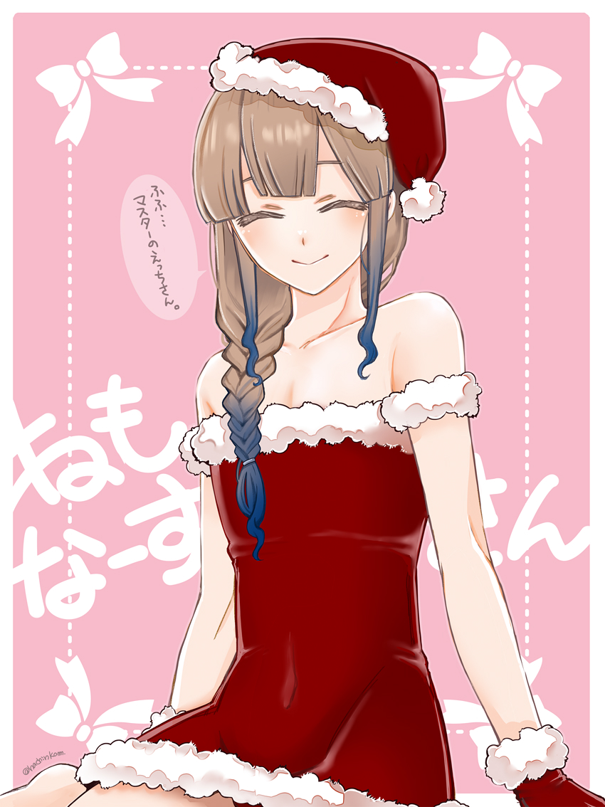 1other blue_hair border bow braid brown_hair closed_eyes closed_mouth commentary_request dotted_line double-parted_bangs dress fate/grand_order fate_(series) flat_chest gloves gradient_hair hachinkom hat looking_at_viewer multicolored_hair nemo_(fate) nurse_nemo_(fate) off_shoulder pink_background santa_costume santa_dress santa_gloves santa_hat sidelocks sitting smile solo speech_bubble translated trap two-tone_hair white_border