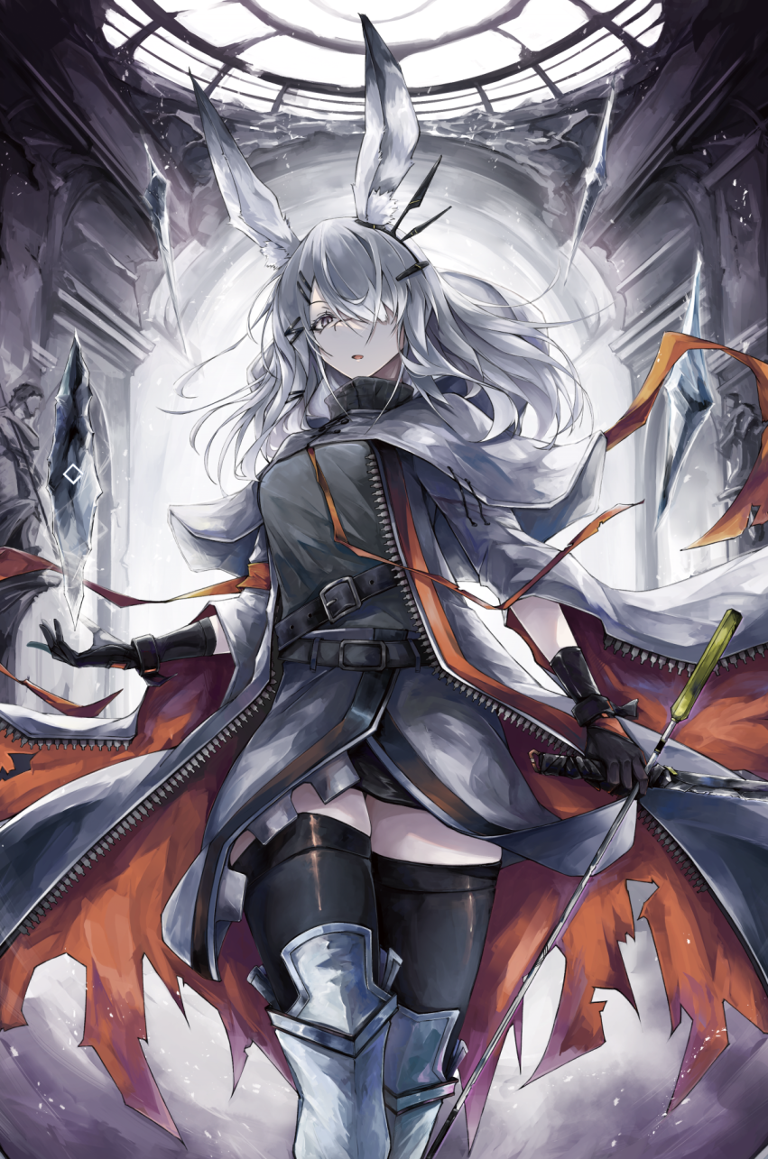 1girl animal_ear_fluff animal_ears arknights armor black_gloves black_thighhighs crystal ear_ornament feet_out_of_frame frostnova_(arknights) gloves greaves grey_hair grey_jacket grey_shirt hair_ornament hair_over_one_eye hairclip highres holding holding_knife jacket knife long_hair looking_at_viewer one_eye_covered open_clothes open_jacket open_mouth originium_arts_(arknights) rabbit_ears rabbit_girl scar scar_on_face scar_on_nose shirt solo thighhighs tsuizi