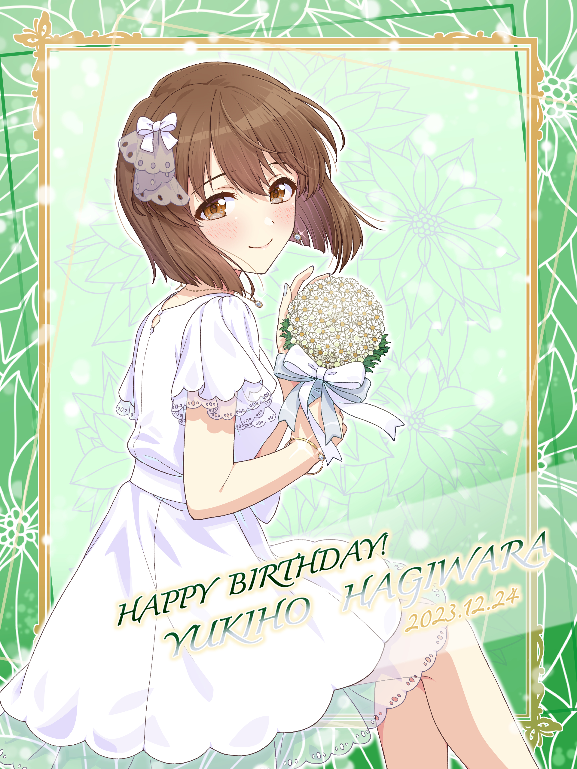 1girl 2023 absurdres blush bob_cut border bouquet bow bracelet breasts brown_eyes brown_hair character_name closed_mouth daisy_(flower) dated dress earrings floating_hair floral_background flower green_background hagiwara_yukiho hair_bow hair_ornament happy_birthday highres holding holding_bouquet holding_flower idolmaster idolmaster_million_live! idolmaster_million_live!_theater_days jewelry looking_at_viewer medium_breasts nail_polish ornate_border pendant ribbon see-through_clothes see-through_sleeves shiro_(ongrokm) short_hair short_sleeves sitting smile solo white_dress white_flower white_nails