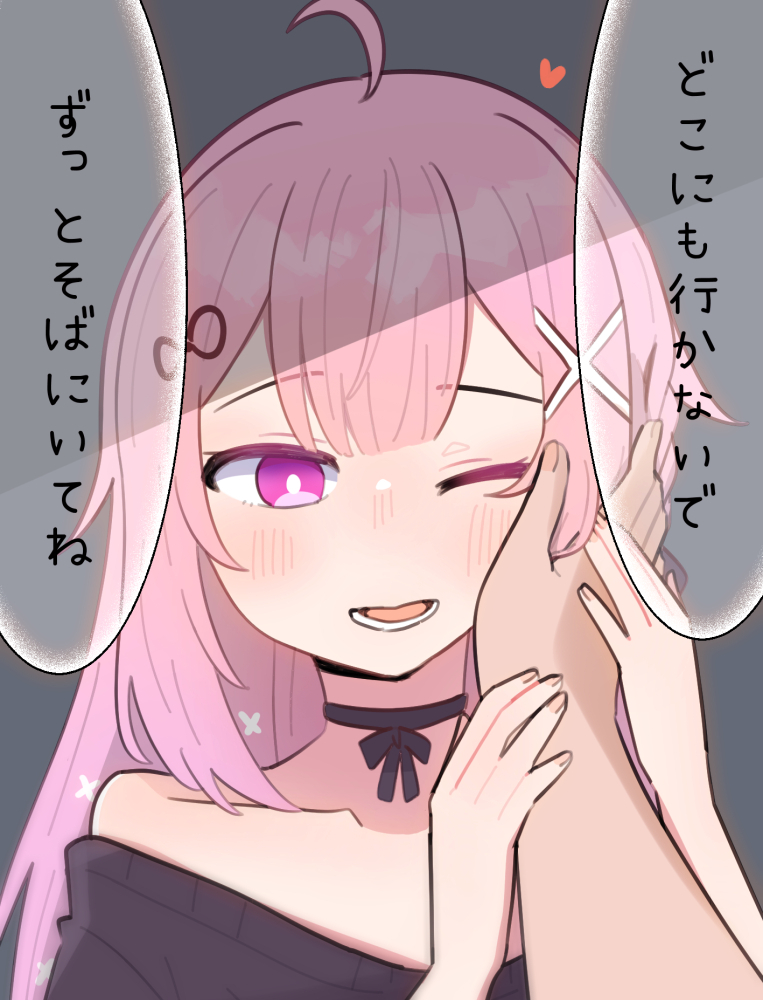 1girl ahoge bare_shoulders choker hand_on_another's_face holding_another's_wrist indie_virtual_youtuber long_hair lower_teeth_only mikeneko_(vtuber) mikeneko_(3rd_costume)_(vtuber) one_eye_closed pink_eyes pink_hair portrait ribbon_choker sakana_(saka11205) sidelocks simple_background smile teeth translated