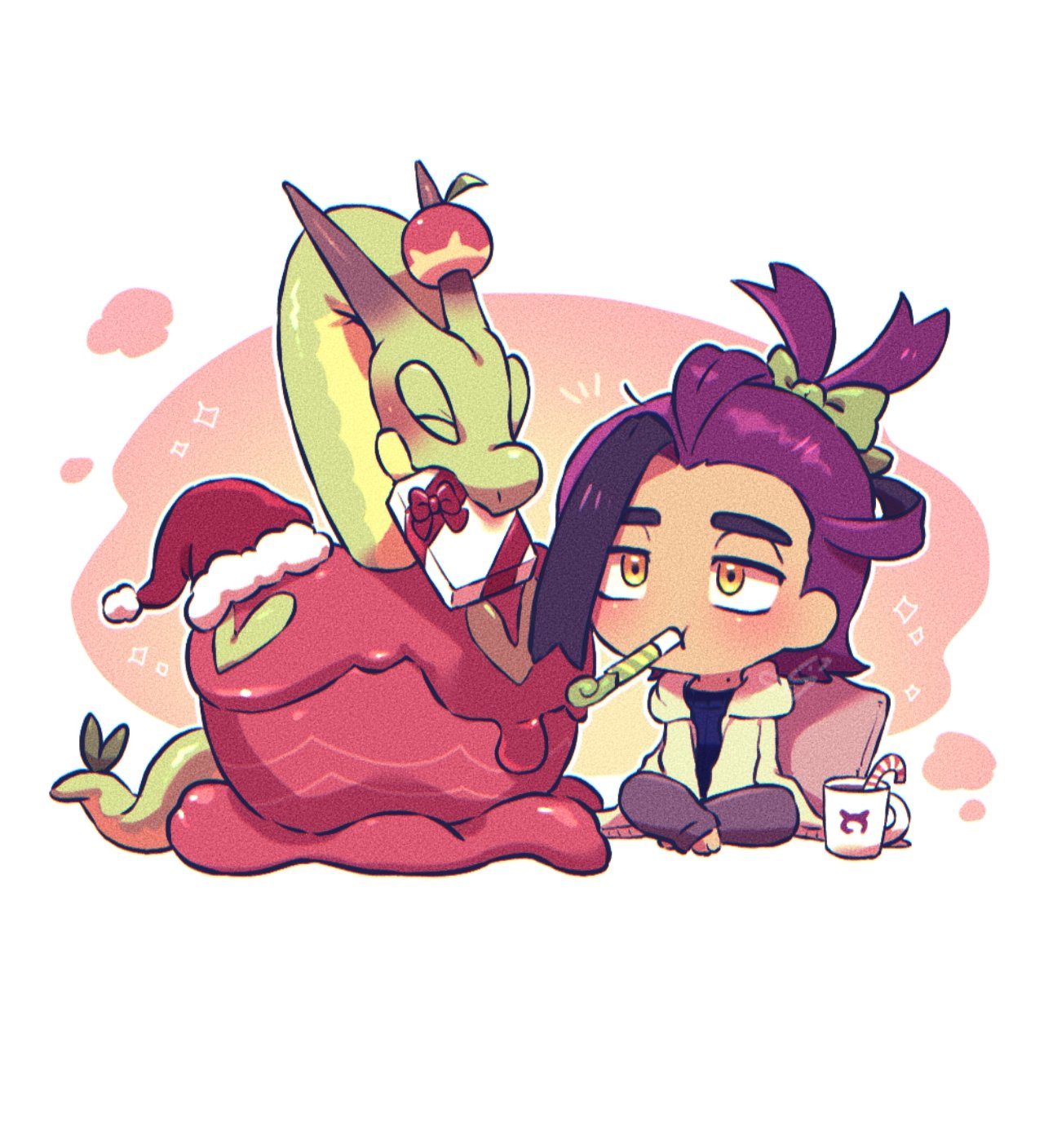 1boy apple bow candy candy_cane christmas closed_eyes commentary cup food fruit gift green_bow hat highres horns hydrapple kieran_(pokemon) nintendo pokemon pokemon_(creature) pokemon_scarlet_and_violet purple_hair s_(esumi_kihomaru) santa_hat sitting untranslatable_commentary tail white_background worm yellow_eyes