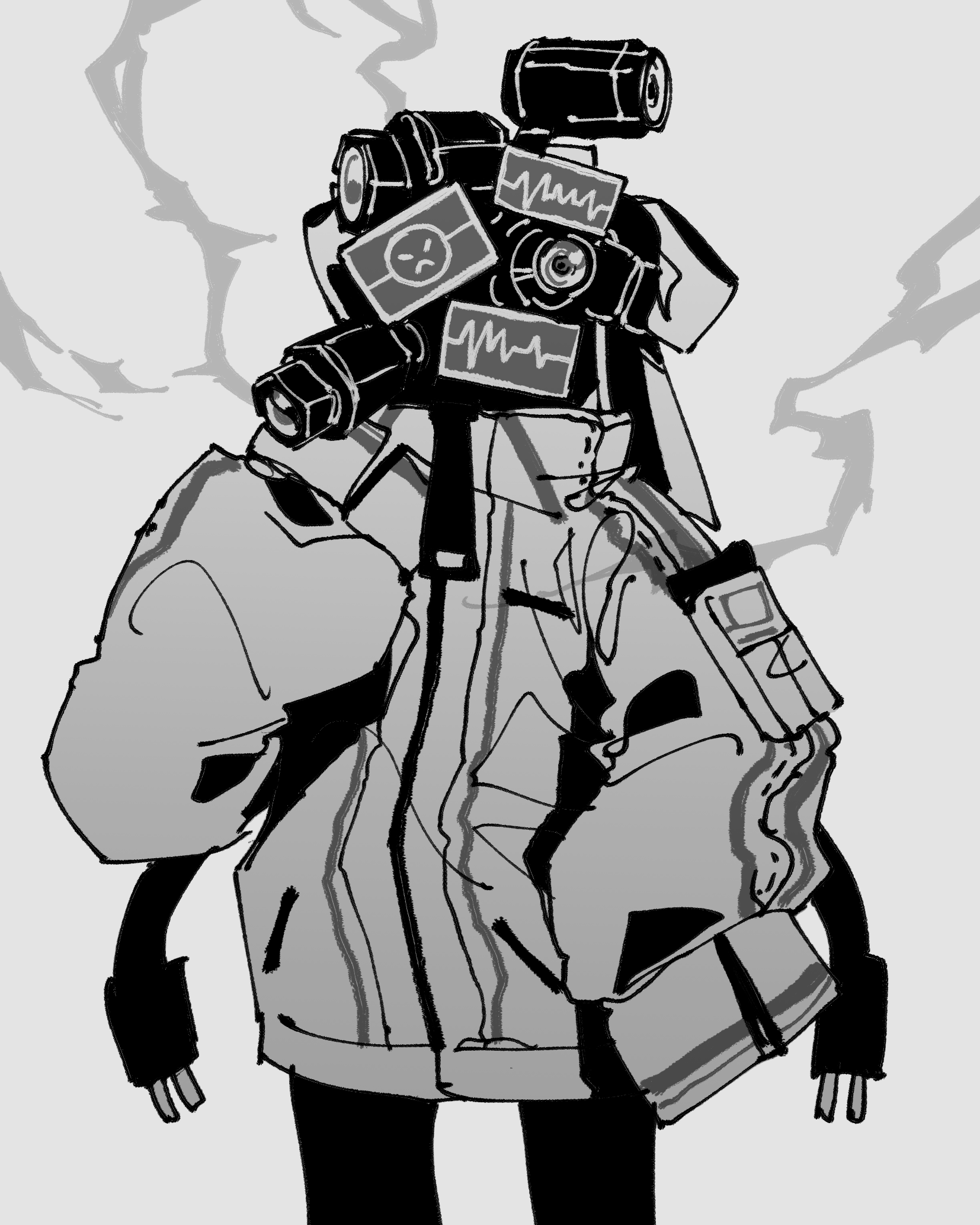 1girl bow cable camera cardiogram cowboy_shot dalloc_(project_moon) electricity hair_bow highres jacket library_of_ruina long_sleeves maskv monitor object_head pantyhose project_moon puffy_long_sleeves puffy_sleeves simple_background solo zipper_pull_tab