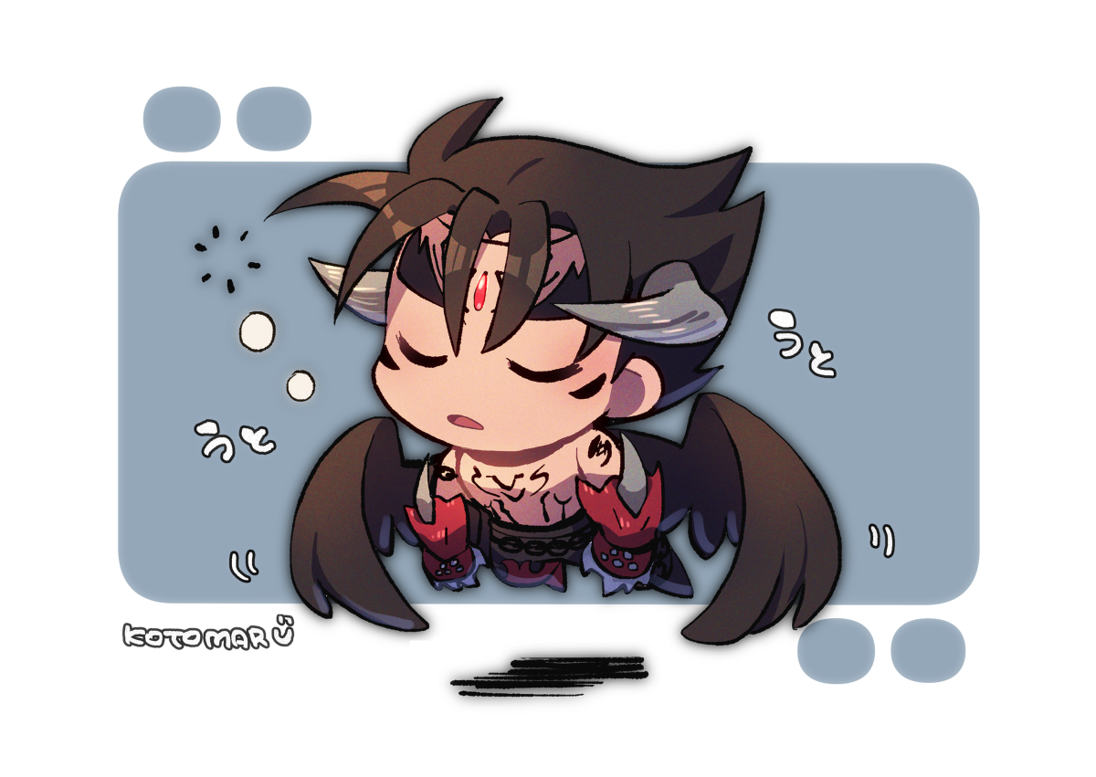 1boy black_hair black_pants black_wings chain chest_tattoo chibi closed_eyes devil_jin facial_mark floating forehead_jewel full_body gloves grey_horns horns kazama_jin kotomaru_(kotokoto_kottan) male_focus no_nose open_mouth pants red_gloves shoulder_tattoo signature sleeping solo studded_gloves tattoo tekken thick_eyebrows topless_male translation_request v-shaped_eyebrows wings