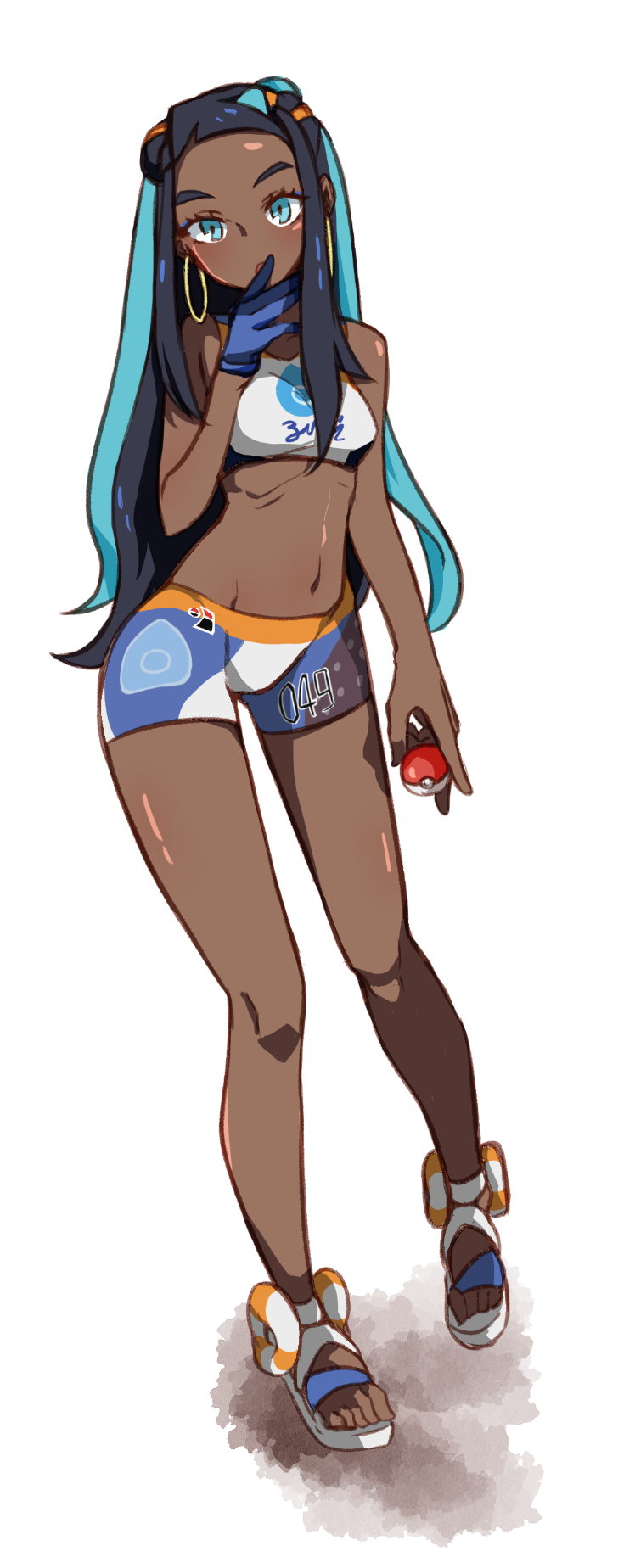 1girl :o black_hair blue_eyes blue_eyeshadow blue_gloves blue_hair breasts covering_own_mouth crop_top dark_skin earrings eyeshadow full_body gloves gold_earrings hand_over_own_mouth head_tilt highres holding holding_poke_ball hoop_earrings jewelry long_hair looking_at_viewer makeup medium_breasts midriff mm_(mm_chair) multicolored_clothes multicolored_hair navel nessa_(pokemon) nintendo partially_fingerless_gloves poke_ball pokemon pokemon_sword_and_shield ribs sandals simple_background single_glove solo sportswear streaked_hair white_background