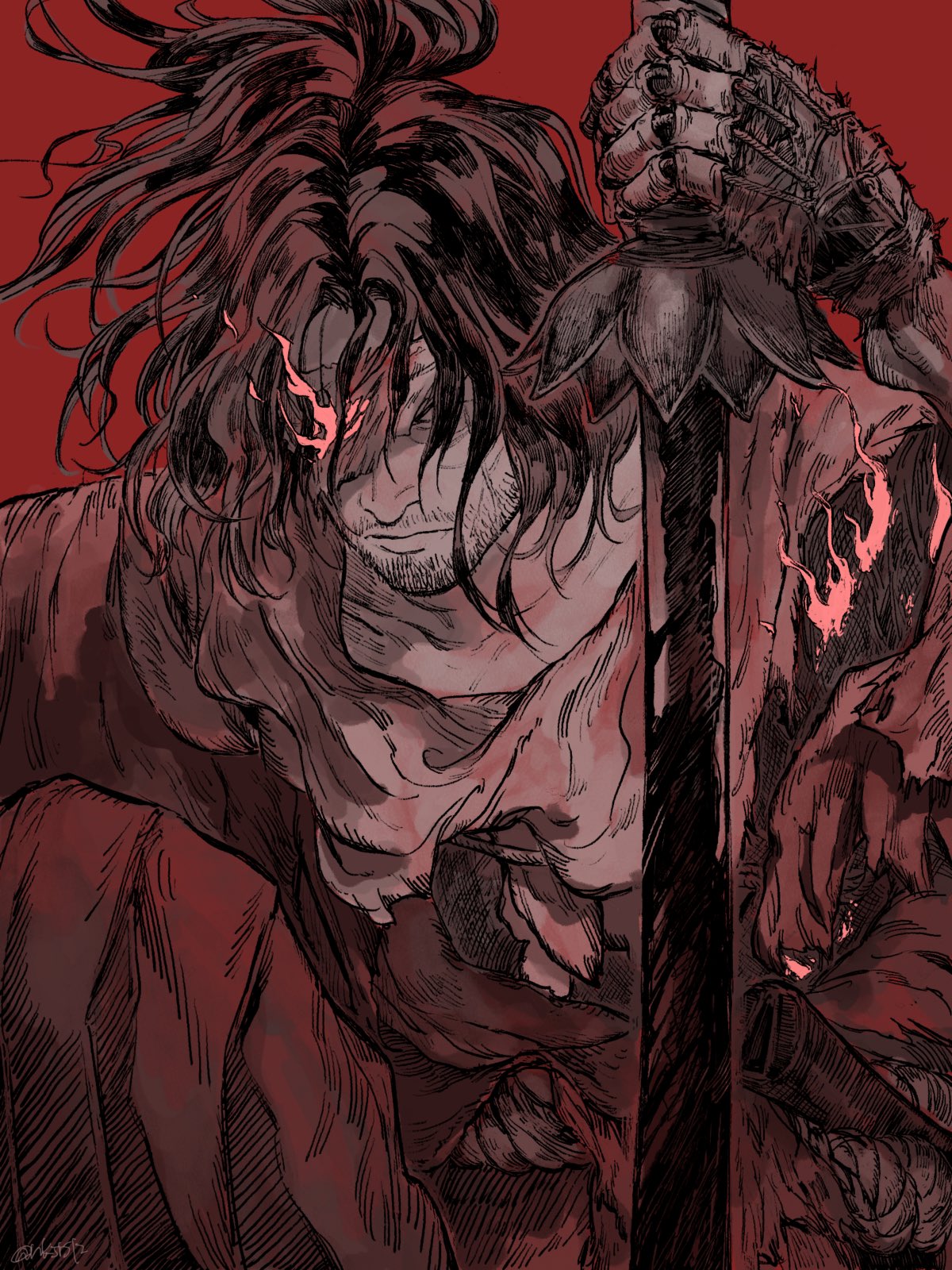 1boy bad_end beard_stubble blood bloody_weapon close-up closed_mouth dark_persona expressionless eyepatch facial_hair facial_scar floating_hair fune_(nkjrs12) hair_over_eyes highres holding holding_sword holding_weapon japanese_clothes male_focus mechanical_arms messy_hair ninja on_one_knee planted planted_sword planted_weapon ponytail prosthesis prosthetic_arm red_background scar scar_on_cheek scar_on_face sekiro sekiro:_shadows_die_twice sheath shura_(sekiro) single_mechanical_arm stubble sword topknot torn_clothes weapon
