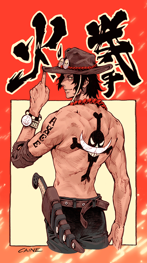 1boy artist_name back back_tattoo bare_back bead_necklace beads black_hair caine666 compass cowboy_hat dagger facial_mark freckles hat jewelry knife log_pose looking_at_viewer male_focus necklace one_piece portgas_d._ace short_hair smile smirk solo standing tattoo teeth third-party_source topless_male translation_request weapon