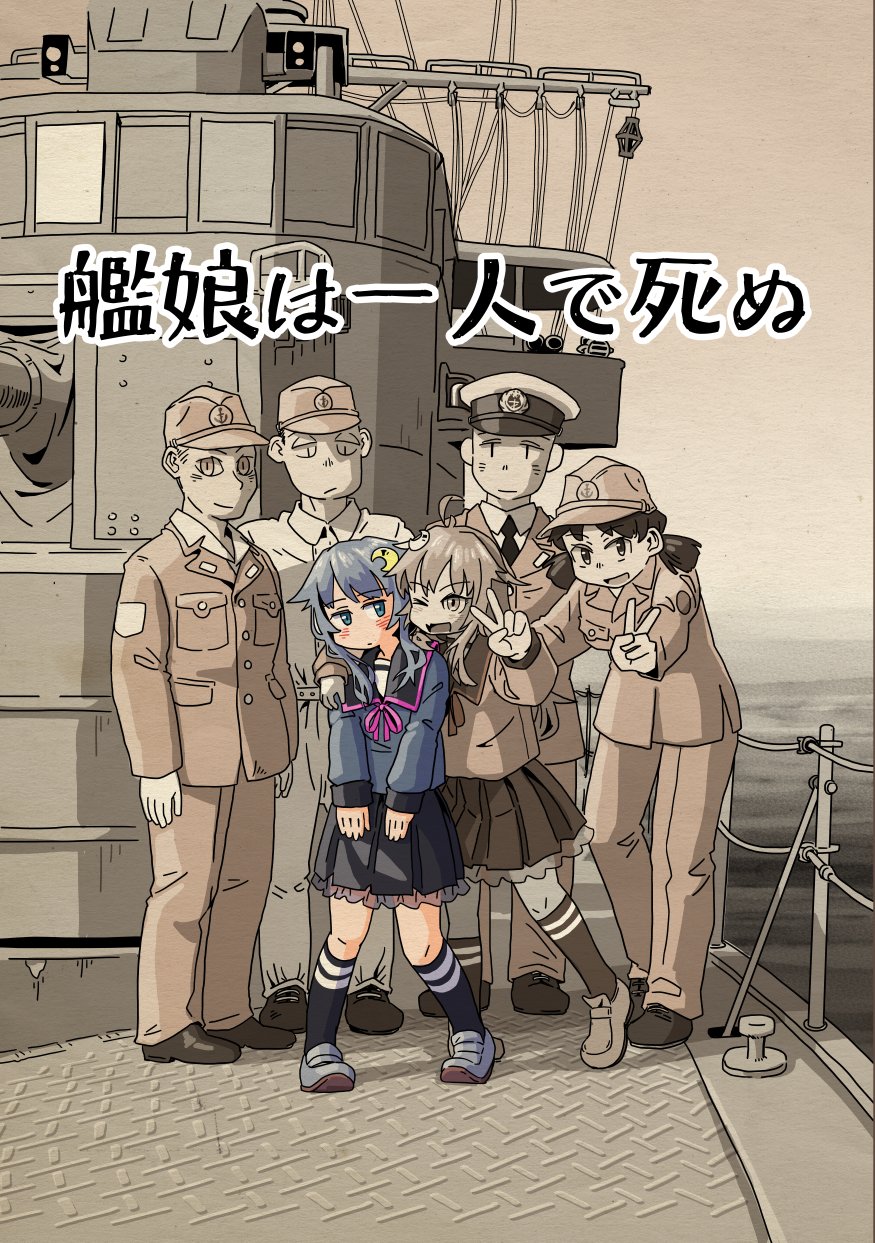 3boys 3girls black_sailor_collar blush closed_mouth comiket_103 cover crescent crescent_hair_ornament hair_ornament hat highres kantai_collection kisei_mt kneehighs long_hair long_sleeves looking_at_viewer military military_uniform multiple_boys multiple_girls one_eye_closed open_mouth pants sailor_collar school_uniform short_twintails skirt socks spot_color standing twintails uzuki_(kancolle) yayoi_(kancolle)