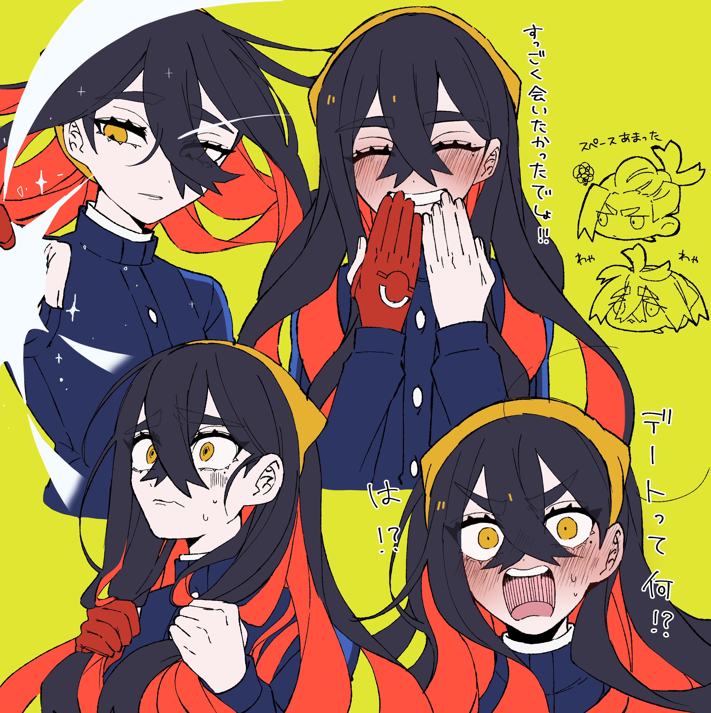 1boy 1girl absurdres black_hair blue_jacket bujin_bb carmine_(pokemon) crossed_bangs eyelashes gloves hair_between_eyes hairband highres holding holding_own_hair jacket kieran_(pokemon) long_sleeves multiple_expressions multiple_views nintendo partially_fingerless_gloves pokemon pokemon_scarlet_and_violet red_gloves red_hair single_glove smile upper_body yellow_background yellow_eyes yellow_hairband