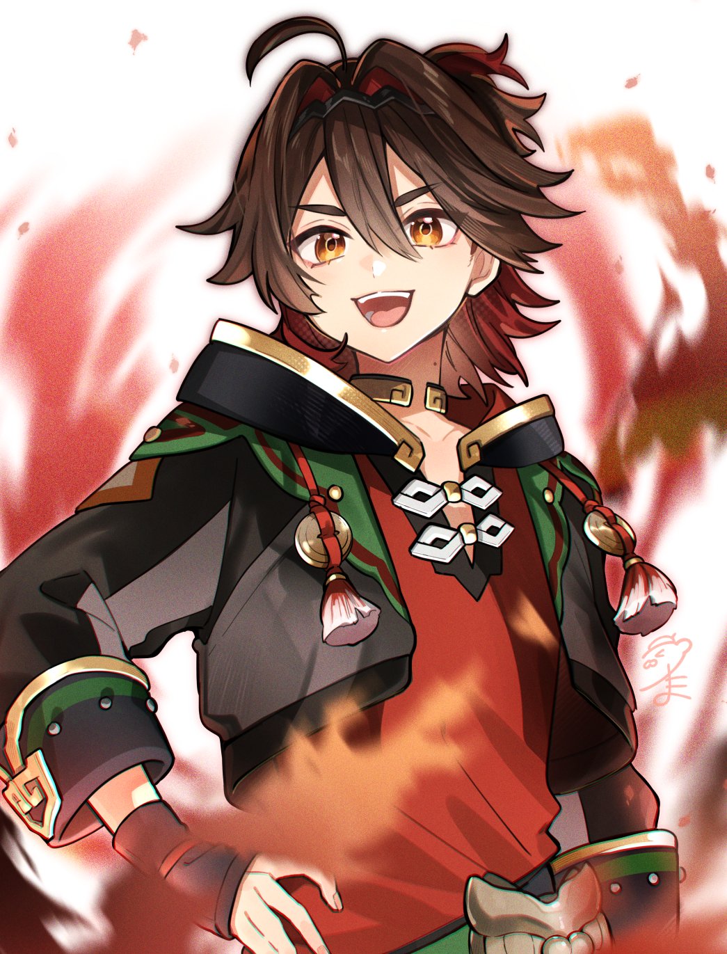 1boy ahoge black_gloves black_jacket brown_hair fingerless_gloves fire gaming_(genshin_impact) genshin_impact gloves hair_between_eyes hair_intakes hand_on_own_hip highres hood hood_down hooded_jacket jacket jewelry long_sleeves looking_at_viewer male_focus mole mole_on_neck multicolored_hair neck_ring open_clothes open_jacket open_mouth orange_eyes red_hair signature simple_background solo tama_(songe) tassel white_background