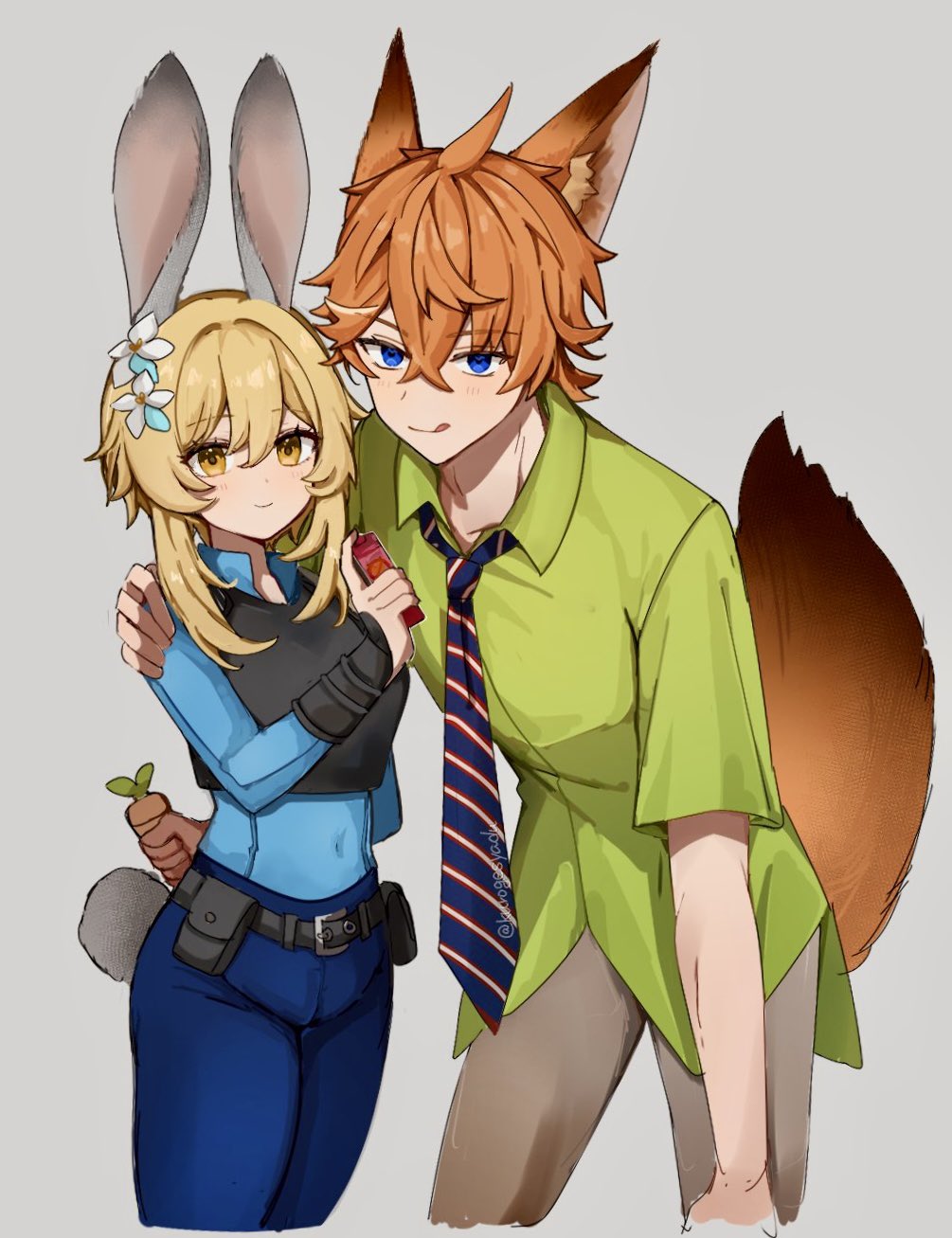 1boy 1girl animal_ears blue_eyes cosplay flower fox_ears fox_tail genshin_impact hair_flower hair_ornament highres judy_hopps judy_hopps_(cosplay) kemonomimi_mode kuromu_shado lumine_(genshin_impact) necktie nick_wilde nick_wilde_(cosplay) police police_uniform policewoman rabbit_ears rabbit_tail shirt short_hair short_hair_with_long_locks smile tail tartaglia_(genshin_impact) white_flower zootopia
