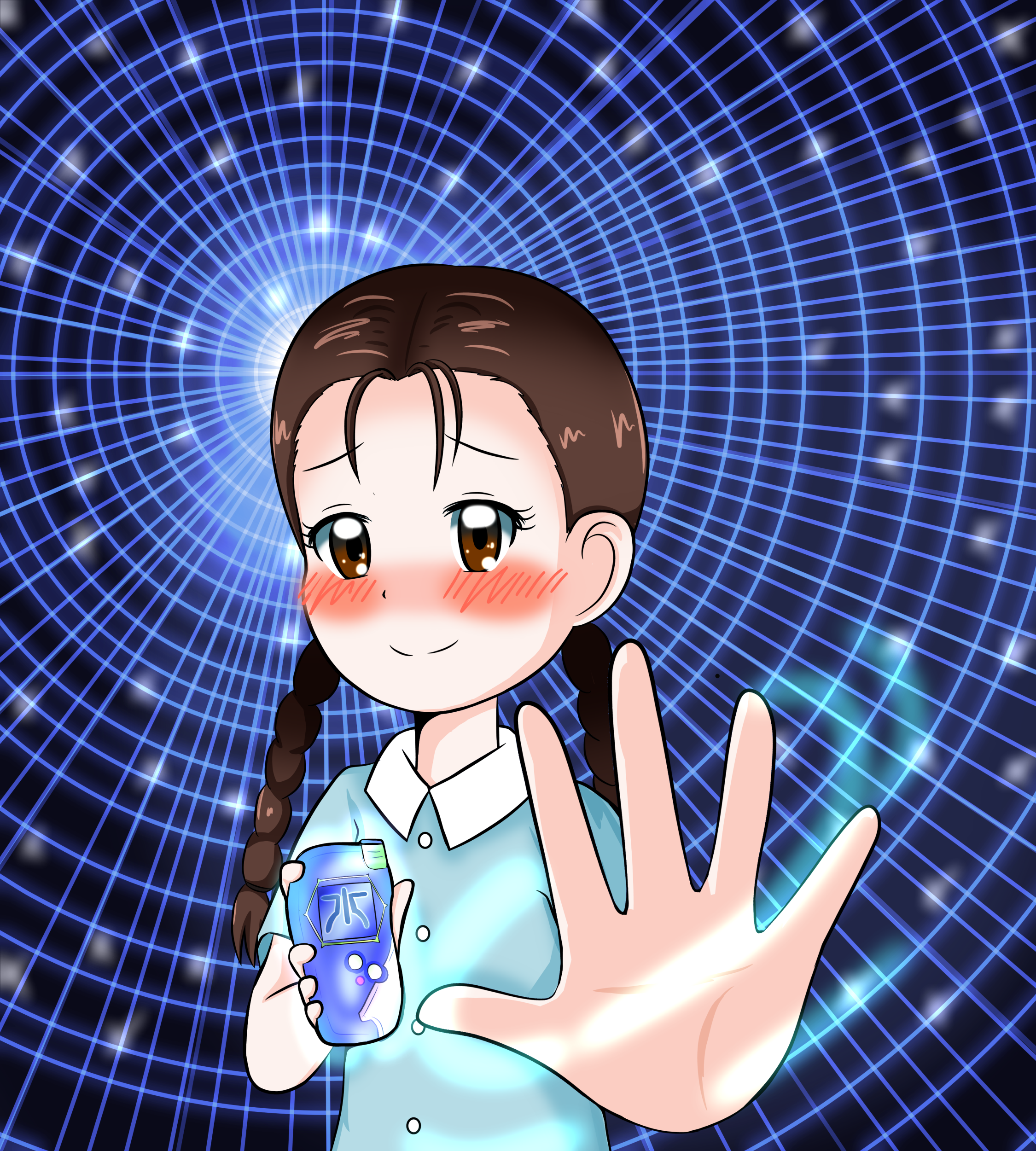 1girl absurdres blush brown_eyes brown_hair chiaki_(digimon) digimon digimon_frontier digivice female_focus highres open_hand smile solo spirit_evolution