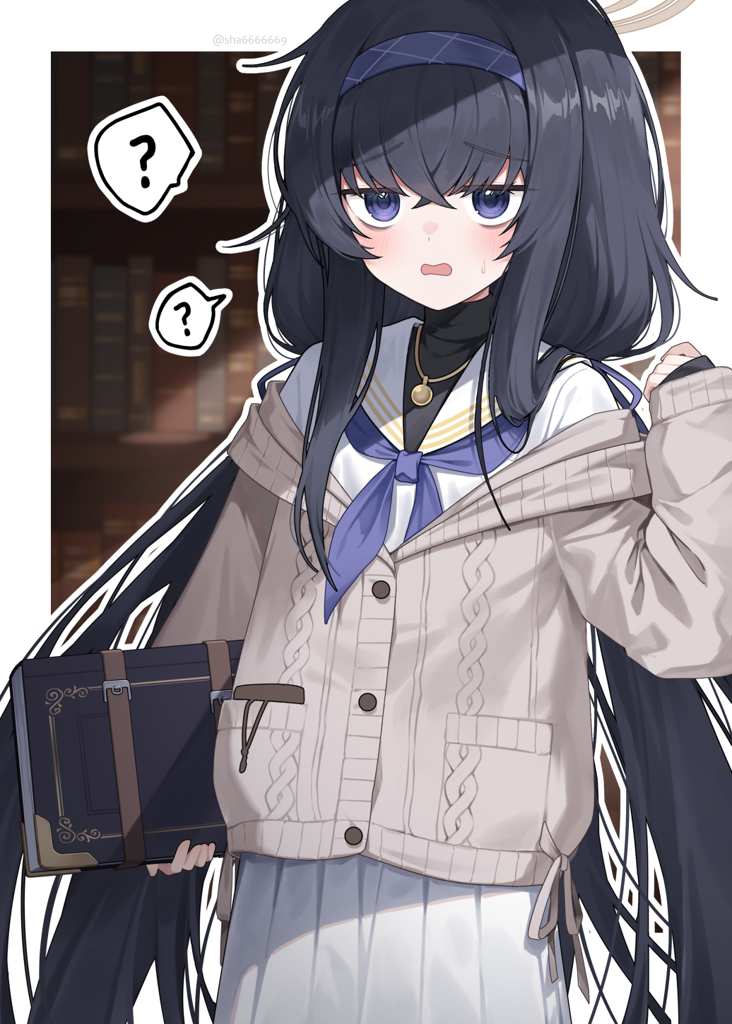 1girl ? bags_under_eyes black_hair blue_archive blue_neckerchief blush book cardigan grey_cardigan hair_between_eyes hairband halo highres holding holding_book jewelry long_hair long_sleeves looking_at_viewer neckerchief open_mouth pendant pleated_skirt purple_eyes purple_hairband sailor_collar shrimp_cake skirt solo spoken_question_mark ui_(blue_archive) white_sailor_collar white_skirt
