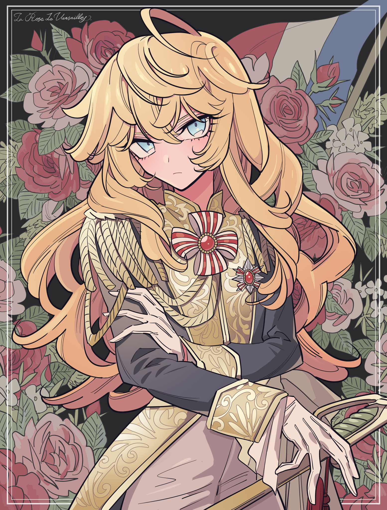 1girl aiguillette blonde_hair blue_eyes blue_jacket closed_mouth copyright_name cowboy_shot epaulettes flower french_flag gloves hair_between_eyes hand_on_own_arm highres jacket long_hair long_sleeves looking_at_viewer meremero oscar_francois_de_jarjayes pants pink_flower pink_rose red_flower red_rose rose solo standing versailles_no_bara white_gloves white_pants