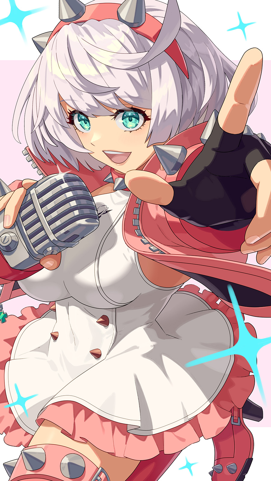 1girl aqua_eyes black_gloves boots bracelet collar dress elphelt_valentine fingerless_gloves frilled_dress frills gloves grey_hair guilty_gear guilty_gear_strive hairband highres holding holding_microphone jacket jewelry looking_at_viewer microphone open_clothes open_jacket open_mouth pink_boots pink_jacket pointing pointing_at_viewer red_boots short_dress short_hair sleeveless sleeveless_dress smile solo sparkle spiked_bracelet spiked_collar spiked_hairband spikes thigh_boots white_dress yagi2013