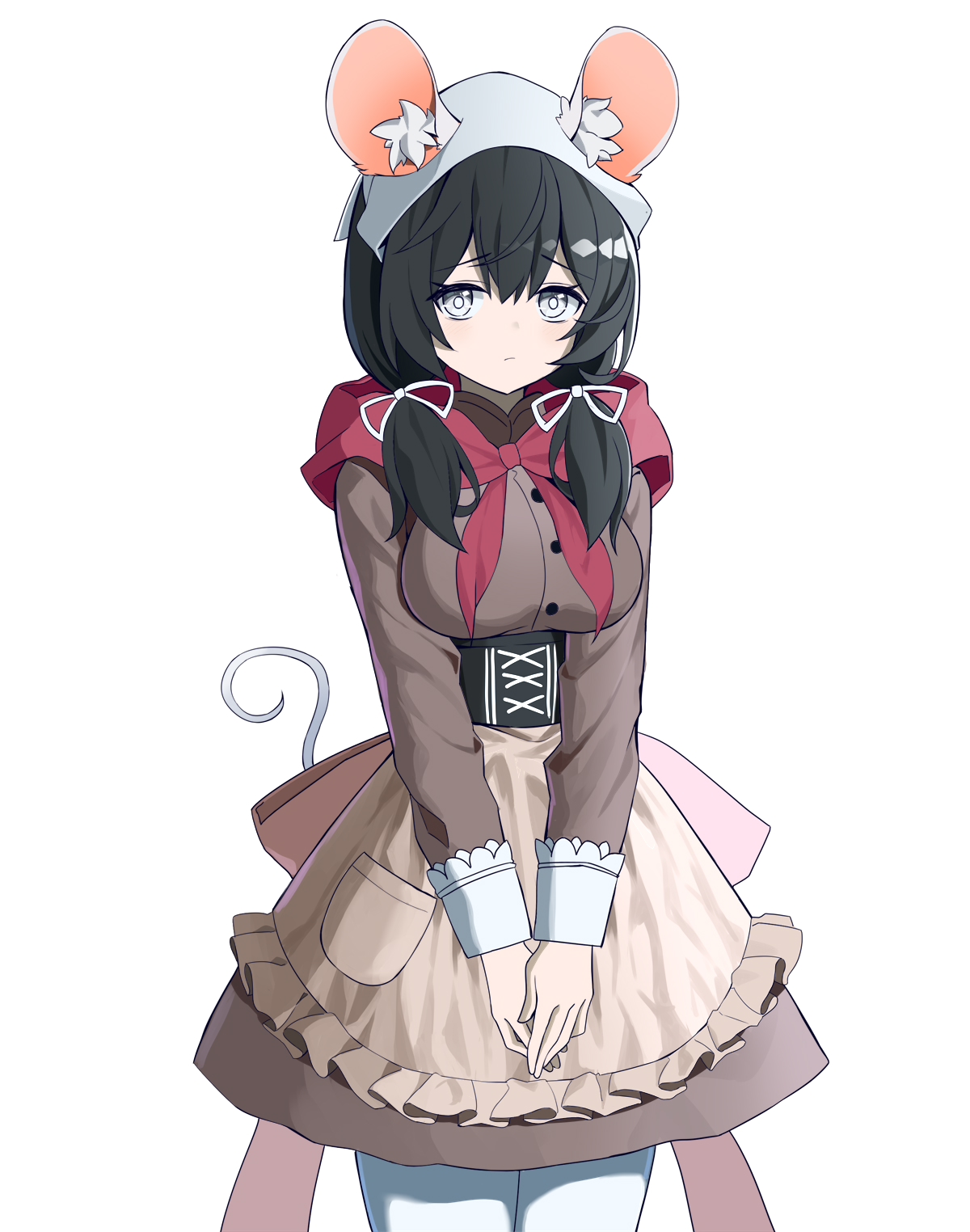 1girl animal_ear_fluff animal_ears apron black_corset black_hair breasts brown_apron brown_dress chinese_commentary closed_mouth commentary_request corset cowboy_shot dress hair_between_eyes hair_ribbon highres large_breasts long_sleeves looking_at_viewer low_twintails maid maidcode1023 mouse_ears mouse_girl ratkin_(rimworld) ribbon rimworld simple_background solo thighhighs twintails underbust white_background white_eyes white_ribbon white_thighhighs