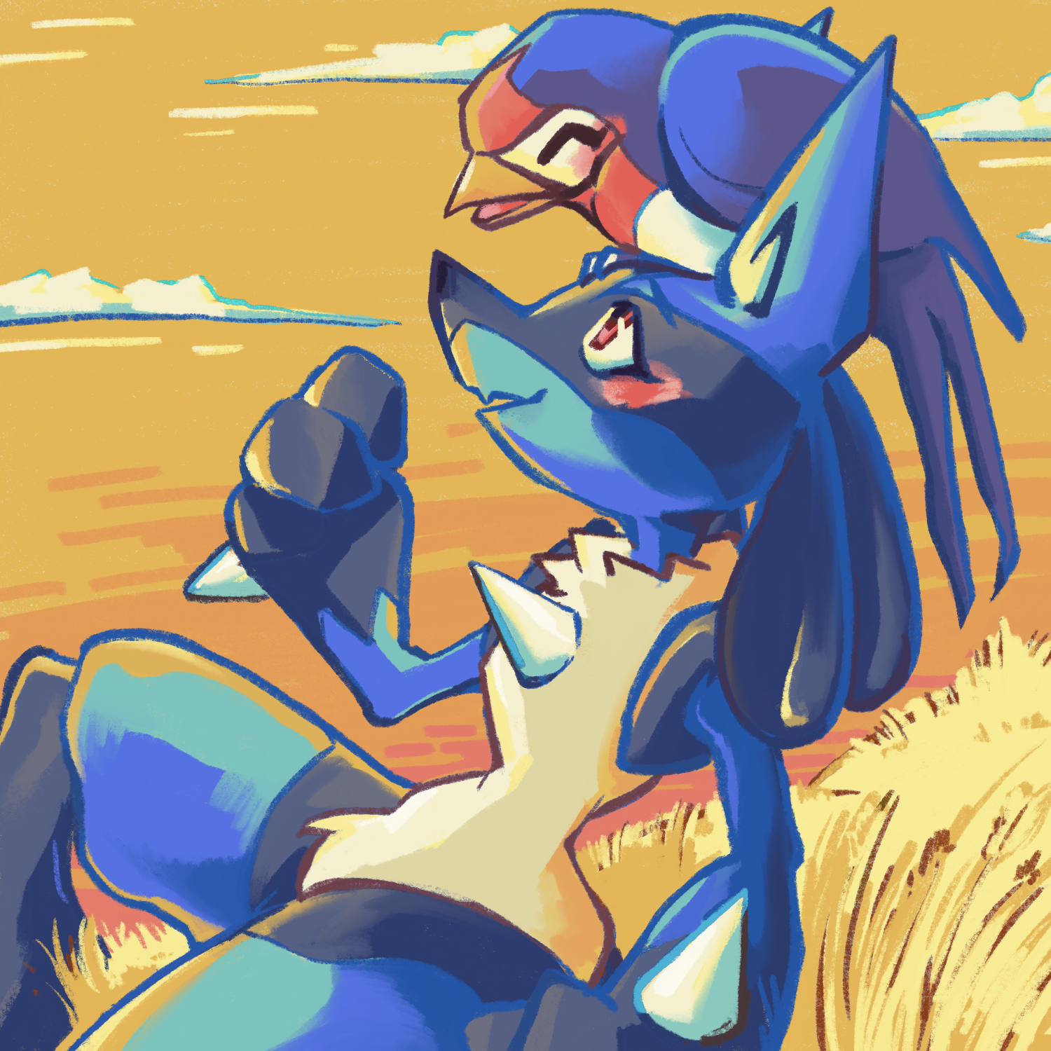 animal animal_on_head bird bird_on_head blush closed_eyes cloud drawfag gen_3_pokemon gen_4_pokemon highres looking_at_another lucario nintendo no_humans on_head outdoors pokemon pokemon_(creature) red_eyes sitting sitting_on_head sitting_on_person sky taillow wheat yellow_sky
