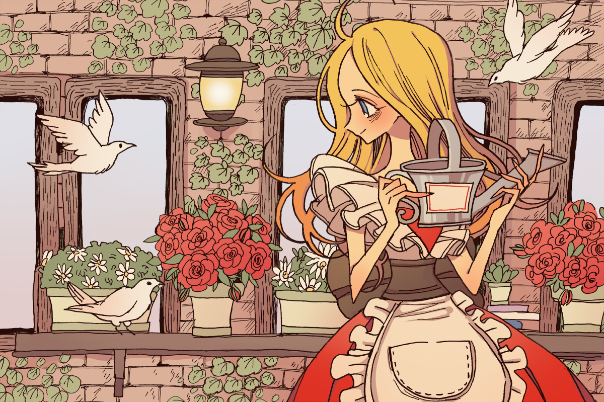 1girl apron bird blonde_hair blue_eyes brick_wall closed_mouth cowboy_shot dove dress flower frilled_apron frills hands_up holding holding_watering_can indoors leaf long_hair looking_to_the_side meremero original plant potted_plant profile red_dress red_flower red_rose rose solo standing wall_lamp watering_can white_apron window
